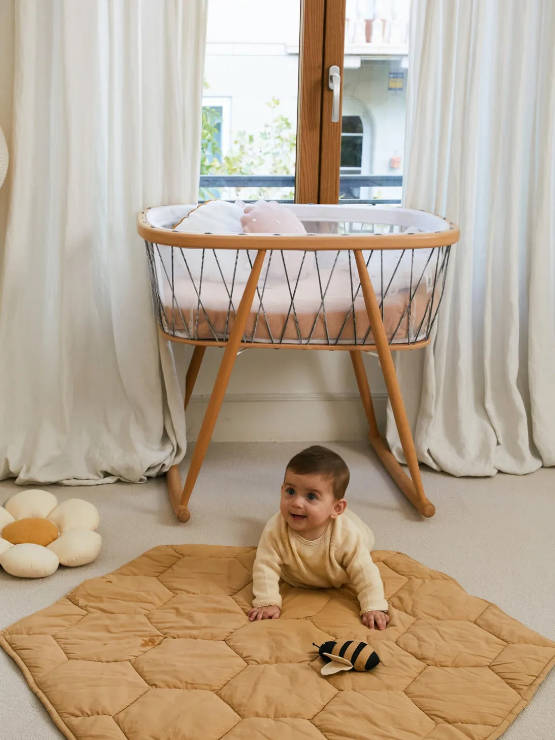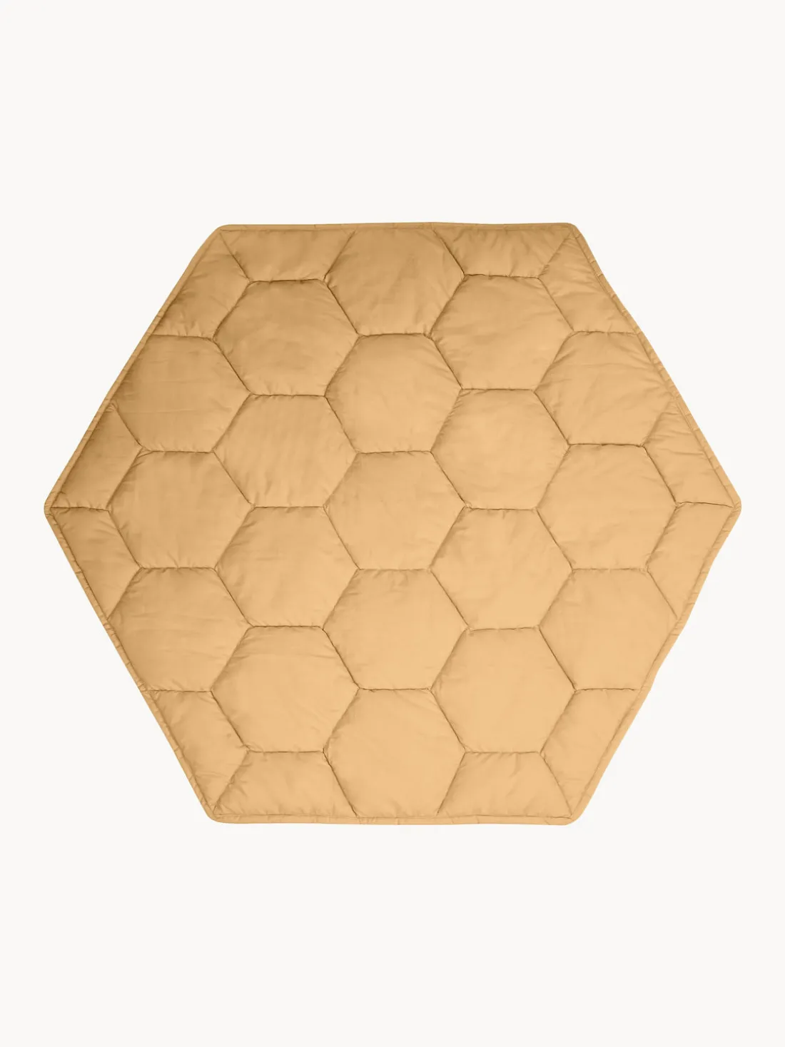La alfombra de juego HONEYCOMB tiene forma hexagonal y está acolchada con el característico dibujo de panal. La alfombra de juego viene con un adorable juguete sonajero de abeja que contiene papel crepitante y un sonajero en su interior.