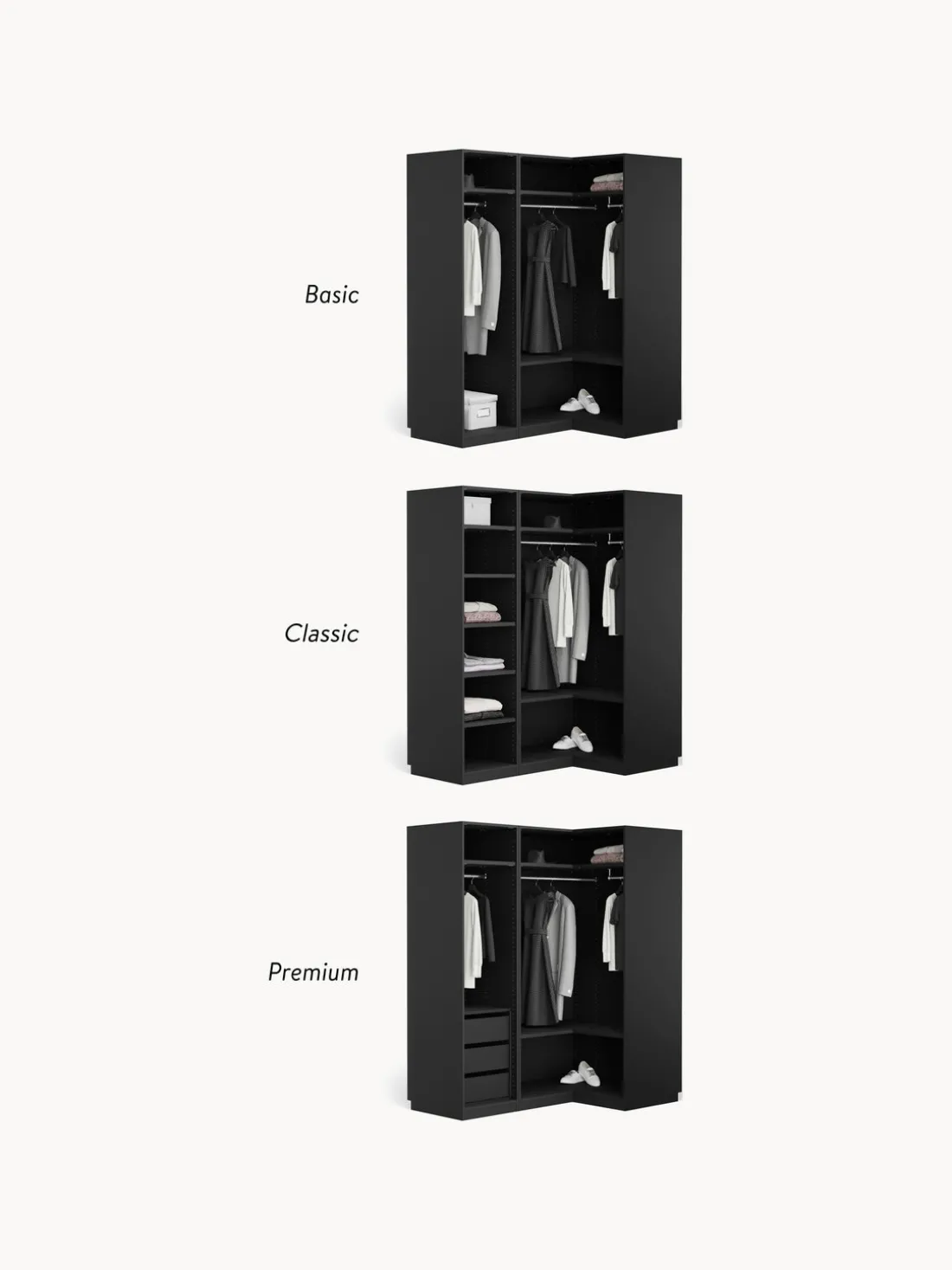 ¡Tu armario debe ser tan único como tu estilo! Nuestro armario Simone te ofrece tres interiores diferentes para que puedeas elegir cual te satisficace tus necesidades mejor: