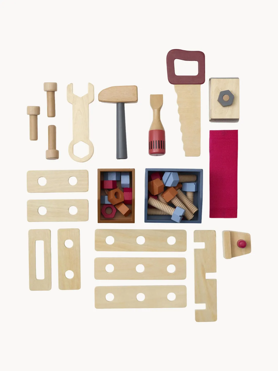 El banco de trabajo tiene agujeros en los que se pueden fijar tornillos, clavos y tablas de construcción. También hay una sierra circular de juguete que gira al pulsar el botón. Y no lo olvides: cuando todo esté terminado, puedes sujetar la construcción en su sitio y lijar la obra maestra con papel de lija. El banco de trabajo de juguete también tiene cajones, estantes y ganchos inteligentes para mantener todas las herramientas de juguete en su lugar. El banco de trabajo incluye: un martillo de juguete, un destornillador, una sierra de juguete, una llave inglesa, un soporte para papel de lija, dos trozos de papel de lija, tres clavos, nueve tornillos, nueve tuercas, cajas de tornillos y ocho tableros de construcción.