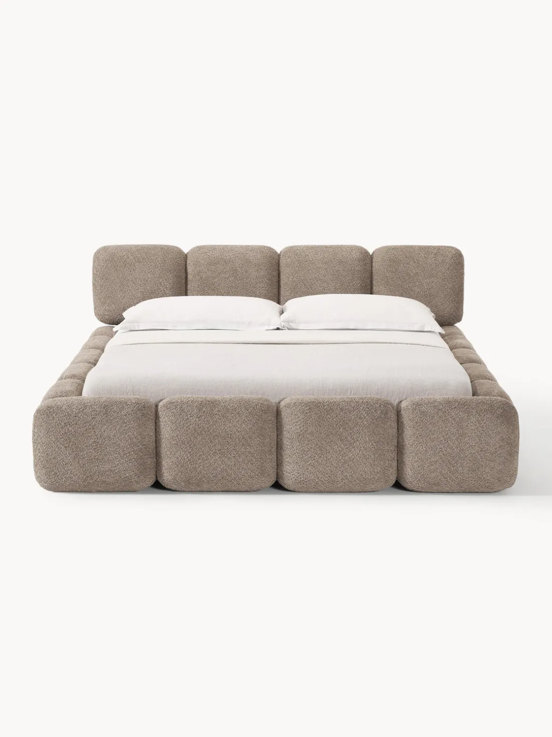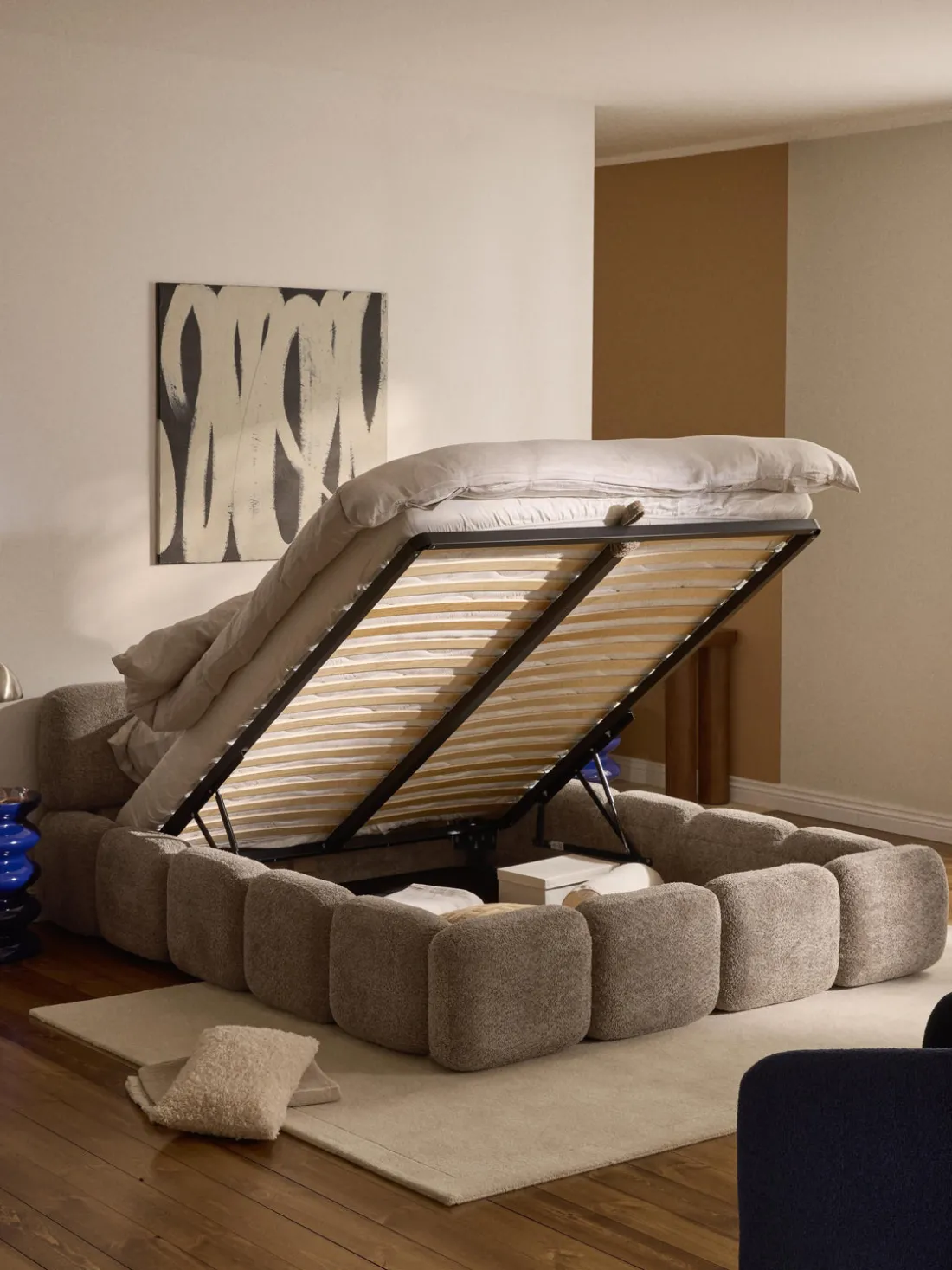 Cama tapizada con espacio de almacenamiento.