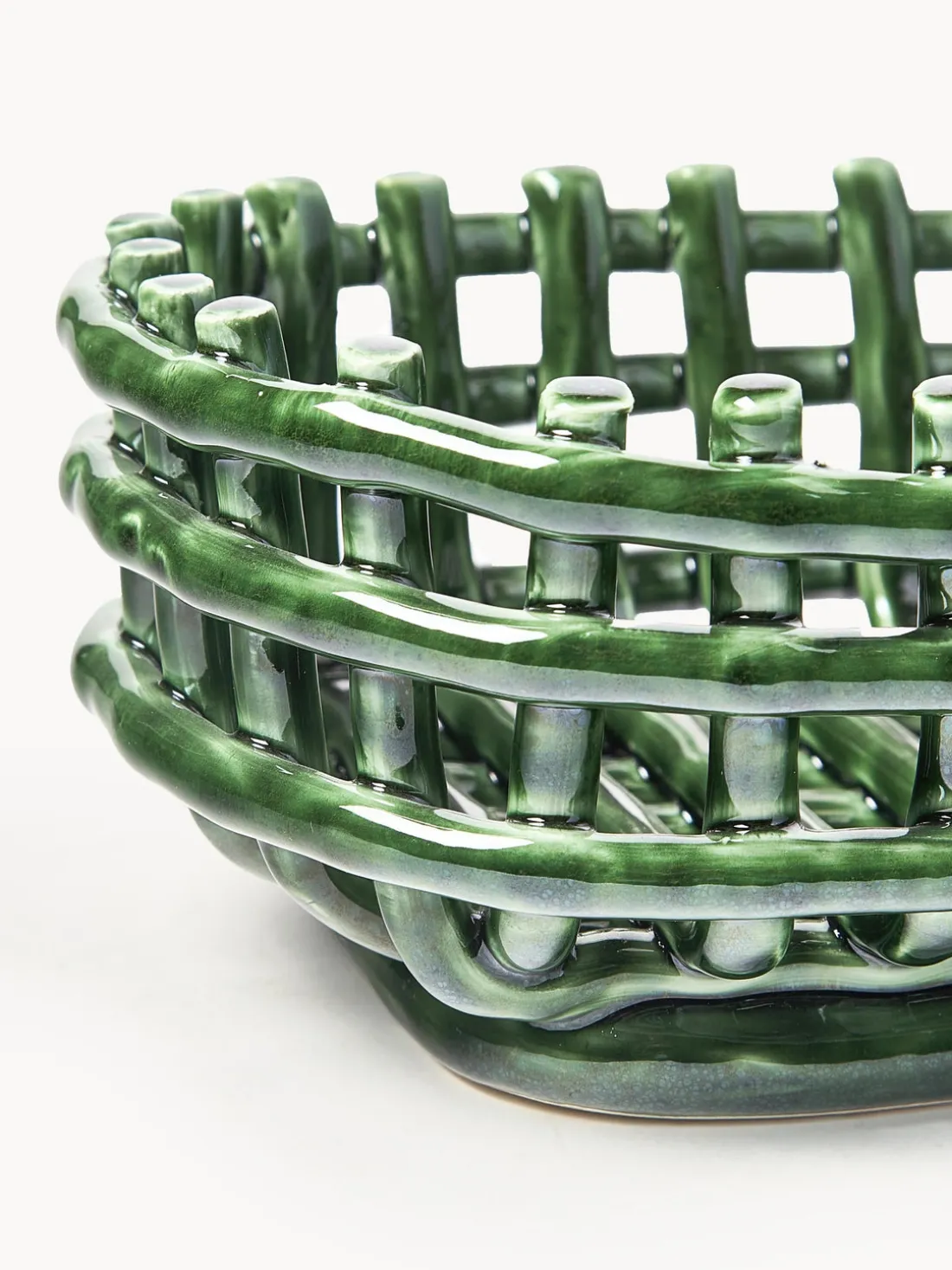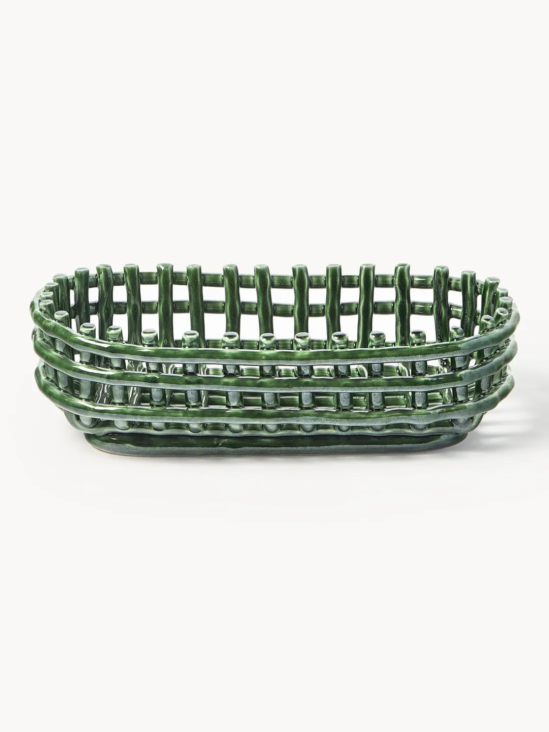 La cesta de almacenaje hecha a mano Nalan evoca la sensación familiar de los recipientes tejidos y traslada la cestería tradicional a la cerámica. Su diseño multifuncional puede utilizarse como macetero, frutero o centro decorativo de una habitación. Siendo moldeada a mano y artísticamente irregular, cada cesta es única.