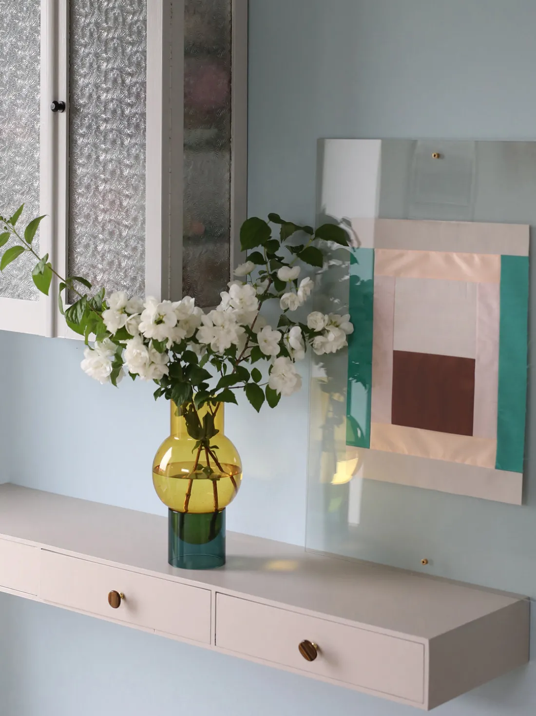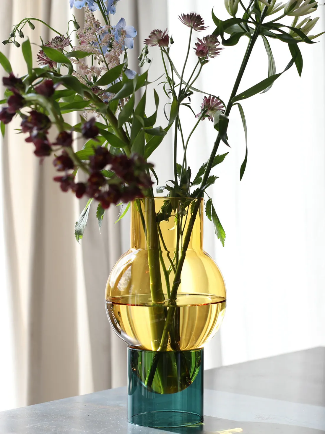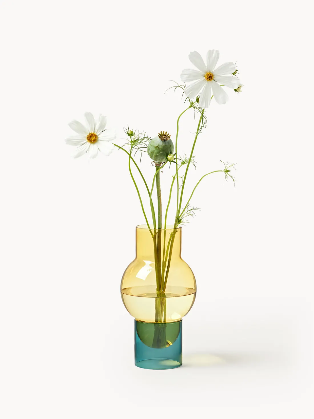 BUBBLE es un gran jarrón de vidrio de dos piezas en el que el jarrón amarillo descansa sobre una base cilíndrica de color cian, creando un aspecto elegante y flotante. Úselo con o sin flores y juegue con la luz, el agua y la sombra en su decoración. La combinación de la suave base amarilla y el vibrante color cian la hace perfecta para exuberantes arreglos florales. Un jarrón clásico de Studio About que combina sencillez, forma y estilo, hermoso incluso sin flores.