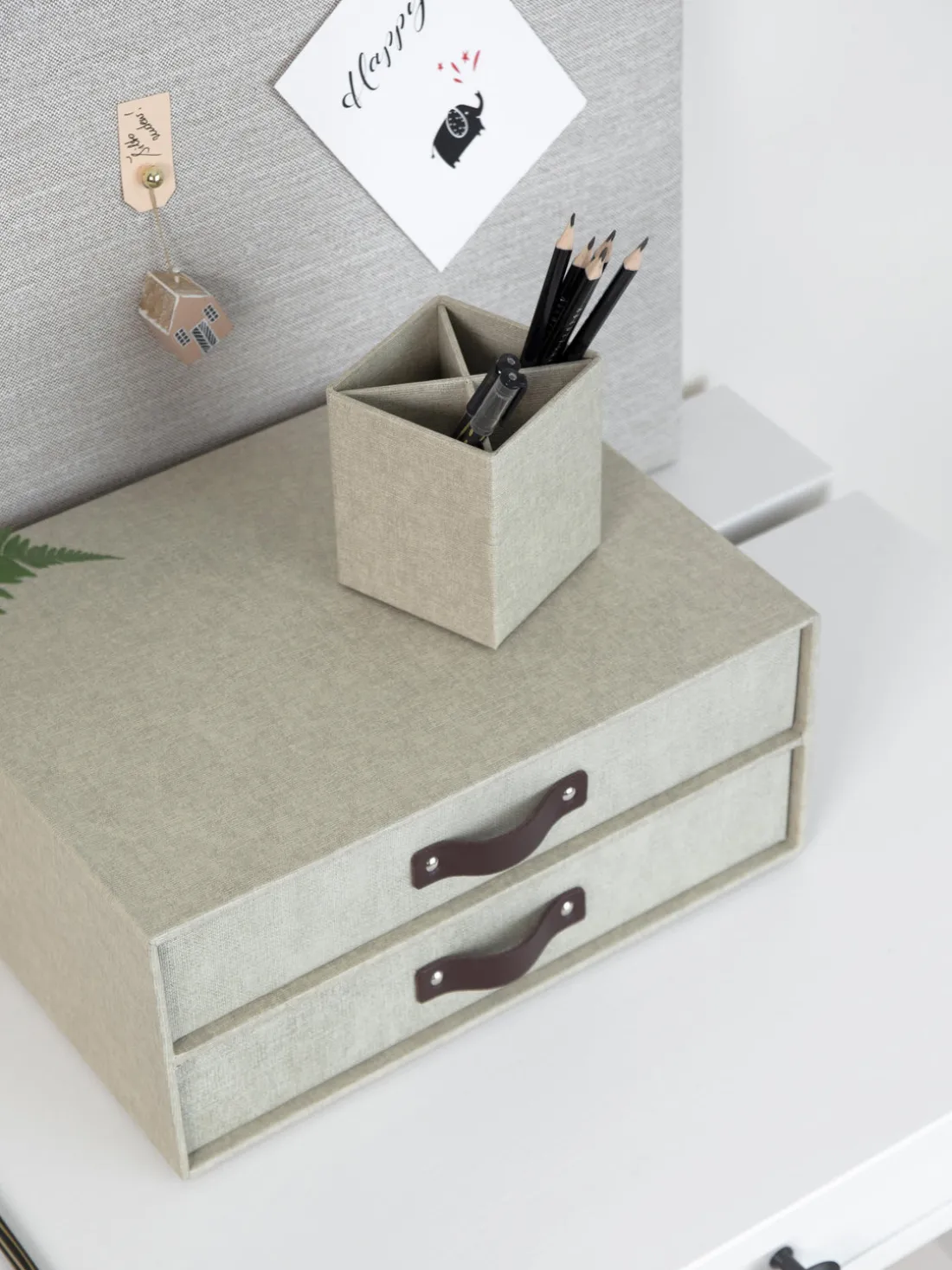 Organizador con dos cajones extraíbles con tiradores de cuero y antideslizantes de goma en la base para mantener orden en tu escritorio. Adecuada para el almacenamiento de documentos de formato DIN A4.