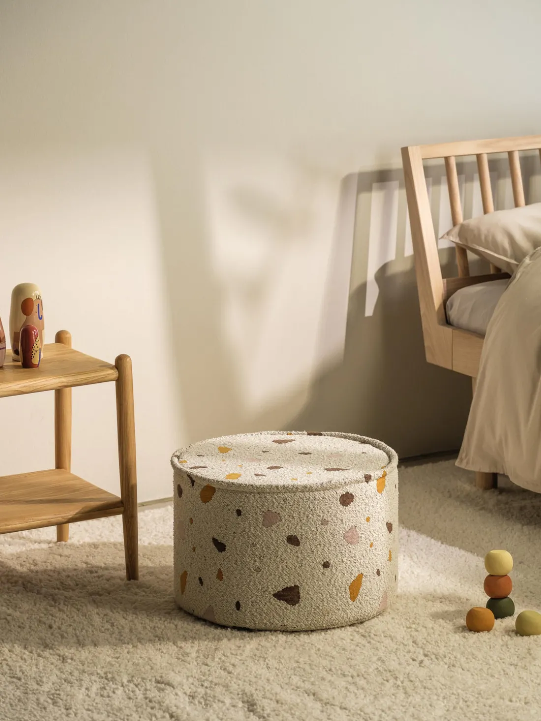 | Color | Bouclé blanco en look terrazo |