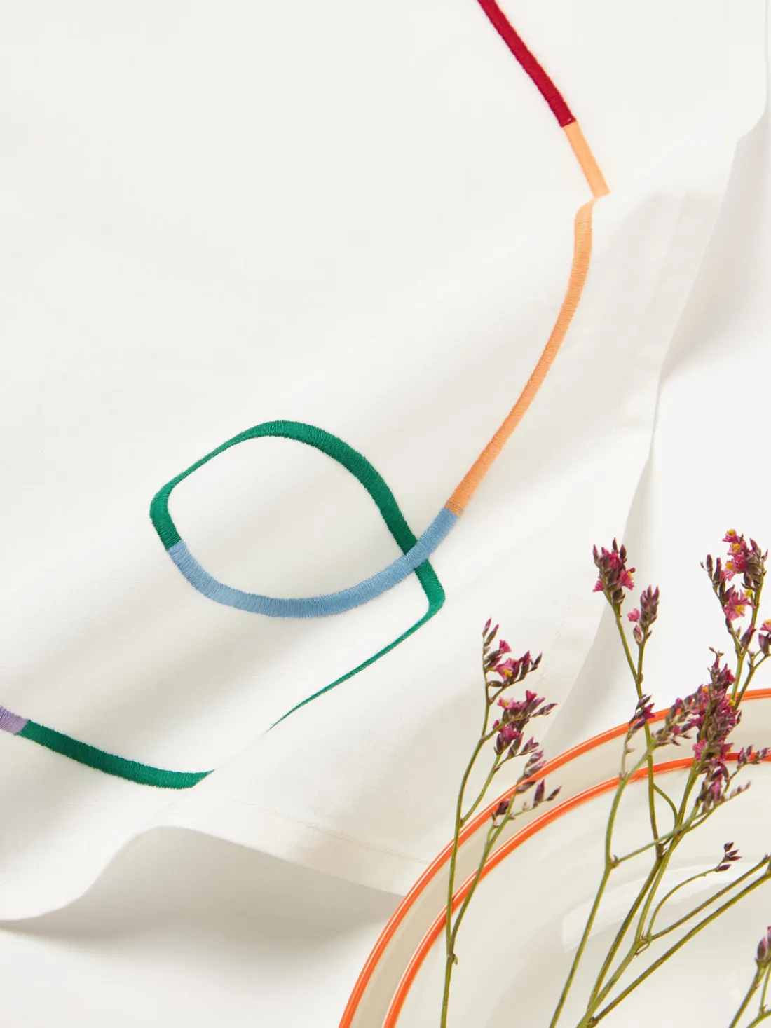 Con SUE traemos un soplo de aire fresco a tu mesa. Las líneas onduladas abstractas y bordadas sobre la tela de algodón lavada crean un aspecto divertido. Ya sea en interiores o exteriores, este mantel queda bien en cualquier lugar. Combínalos con platos coloridos y accesorios alegres para conseguir un estilo realmente cool.
