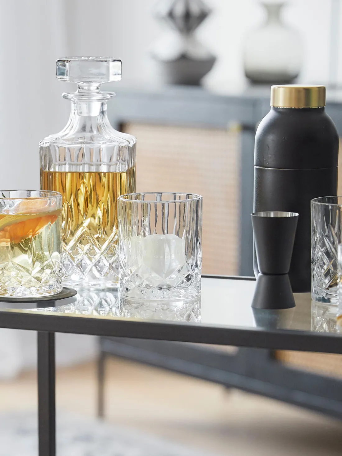 Set de cóctel de 3 piezas, compuesto por una coctelera con tapadera con colador integrado, un colador y un medidor