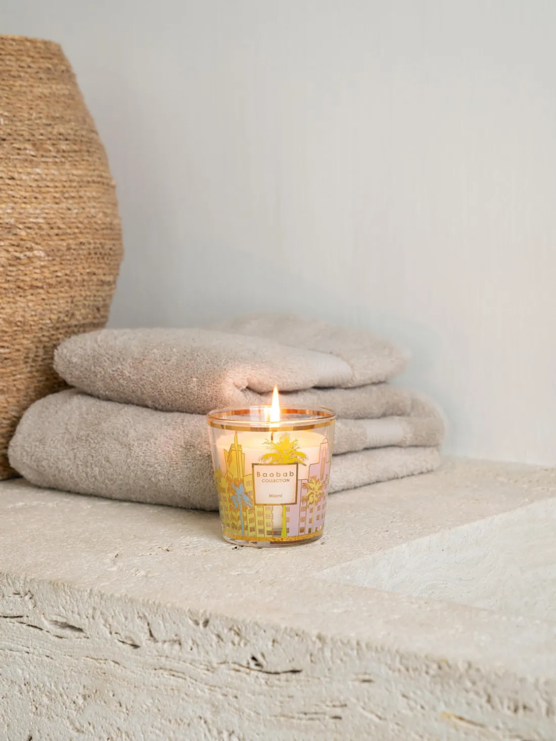 La vela perfumada MIAMI está decorada con una serigrafía en tonos pastel que evoca la arquitectura de los edificios Art Déco de South Beach.