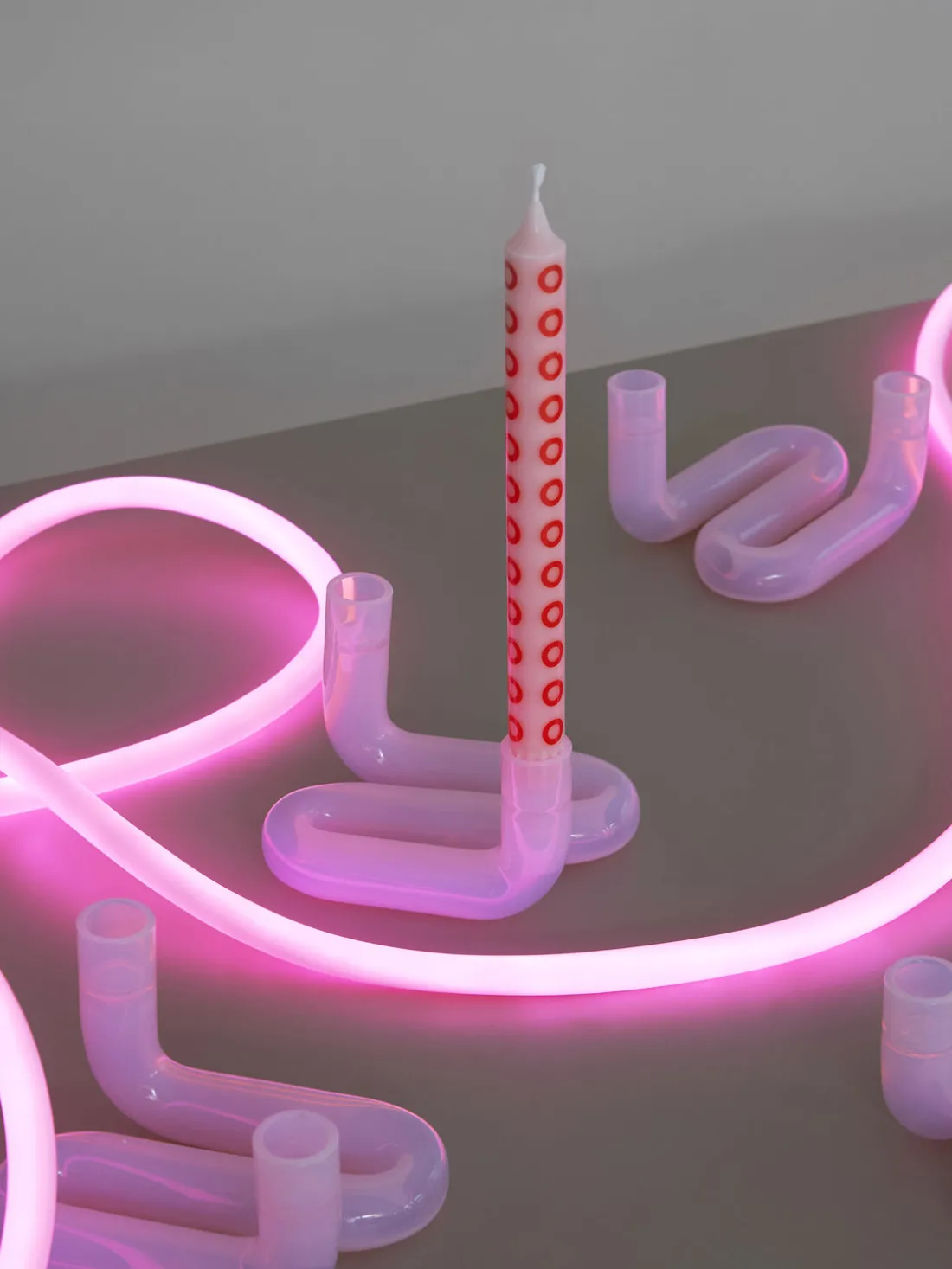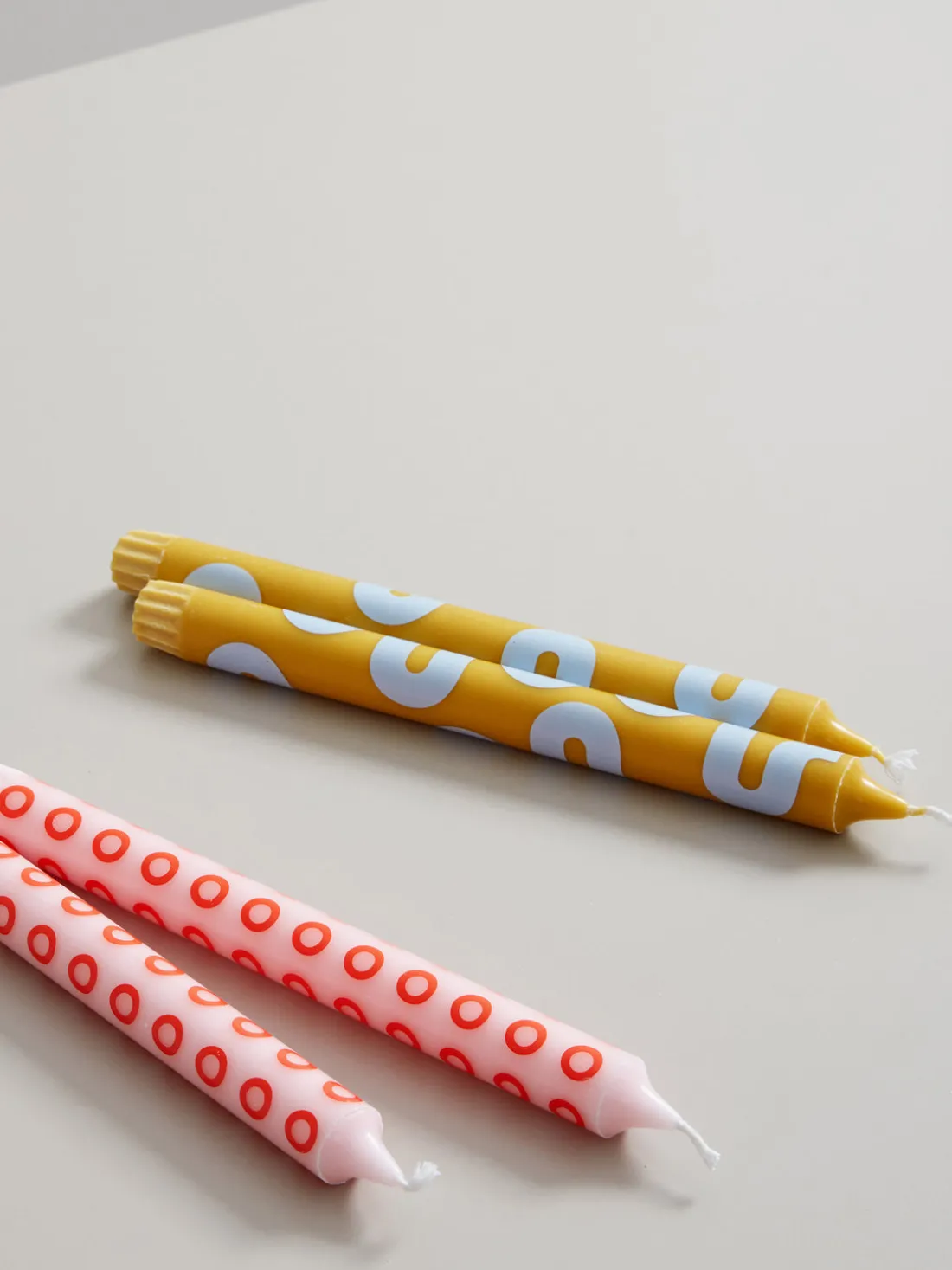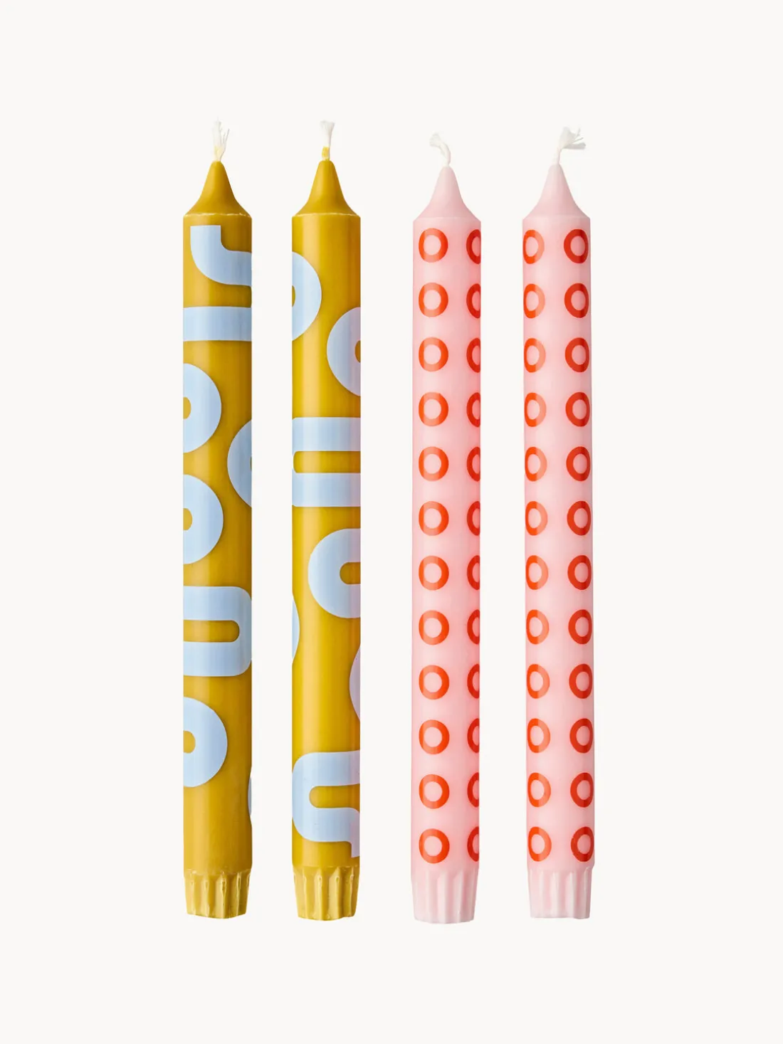 La colección de velas HAPPY se compone de cuatro colores diferentes y dos patrones gráficos. Tienen las mismas dimensiones que las velas clásicas, por lo que son perfectas para cualquier candelabro estándar.