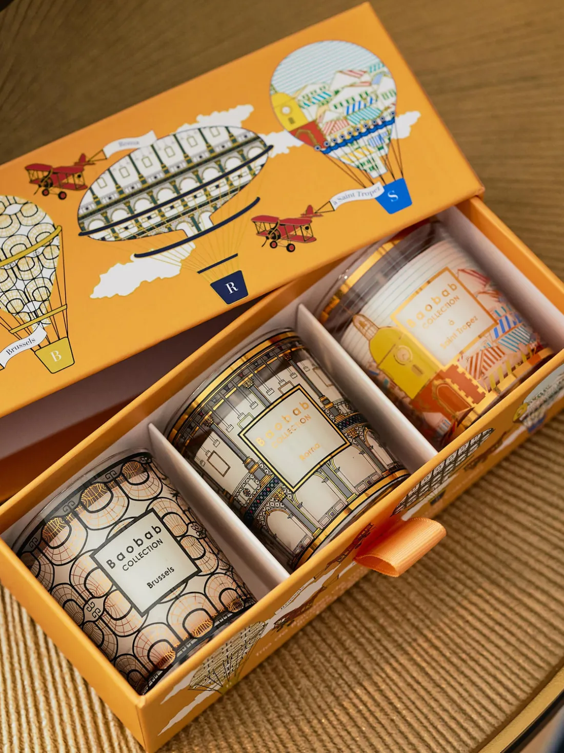 El set viene en una caja de regalo y contiene tres velas perfumadas diferentes: Brussels (cedro, sándalo y miel), À Saint-Tropez (tomillo, albahaca y menta) y Roma (pachulí, haba tonka y cilantro).