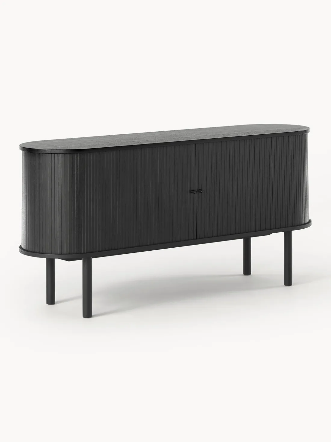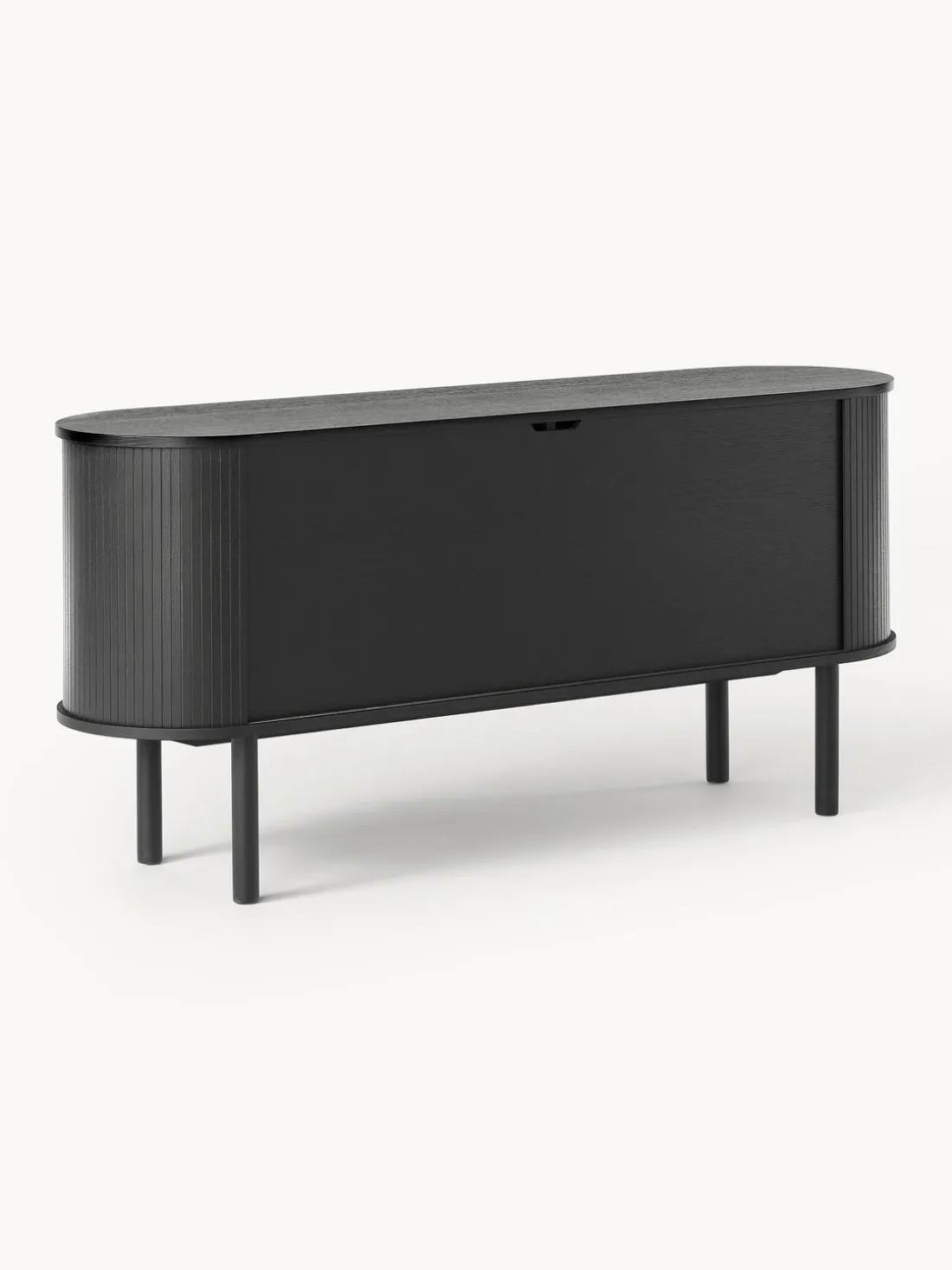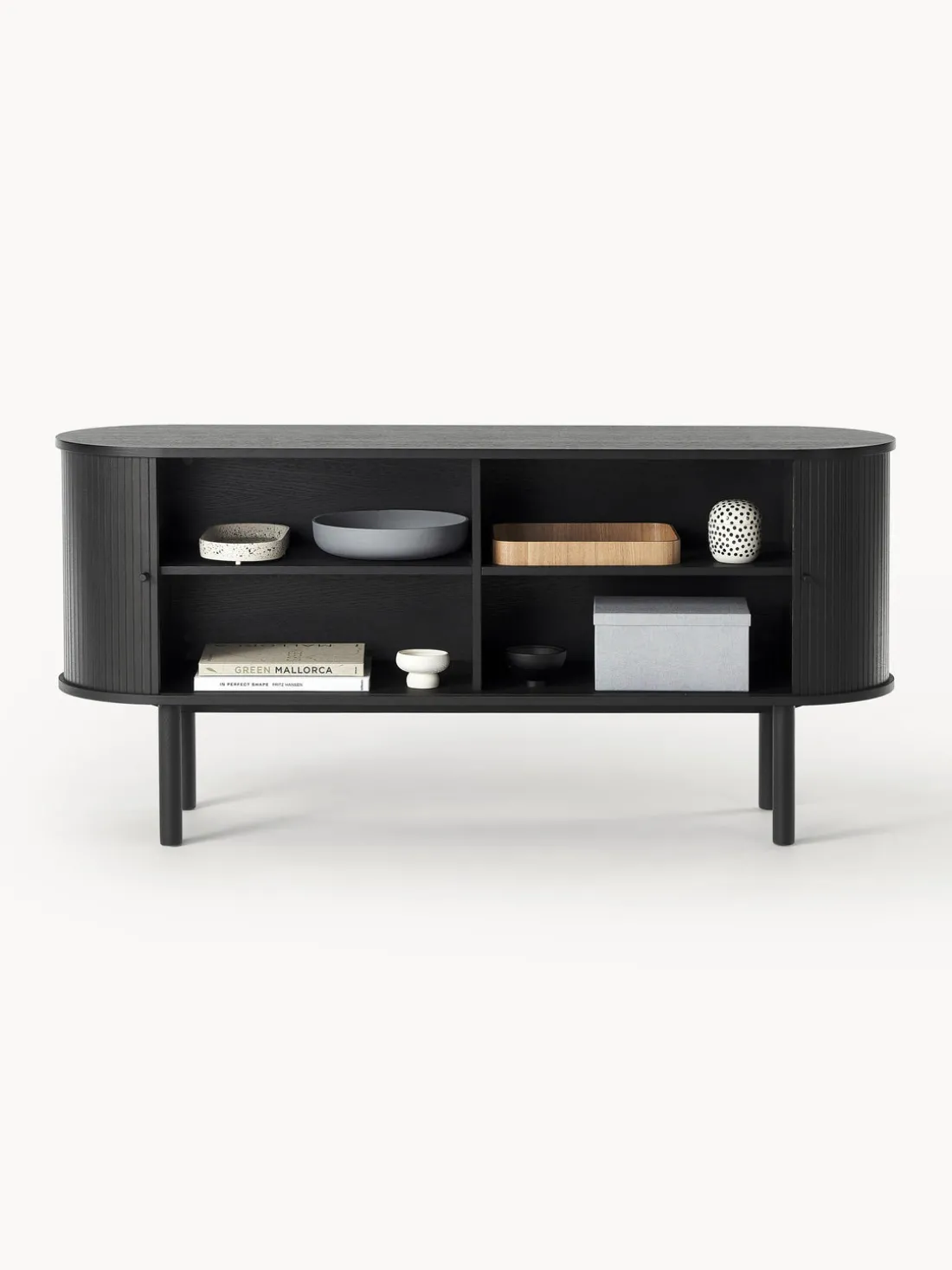 El producto tiene dos puertas correderas, dos compartimentos y un pasacables en la parte trasera.