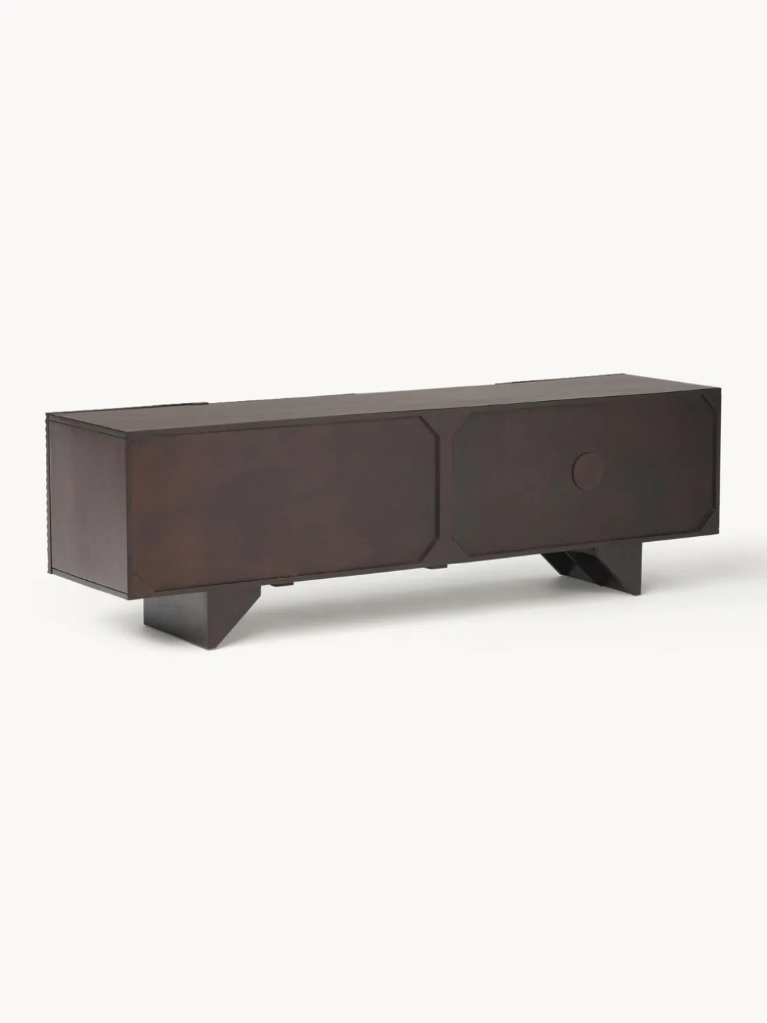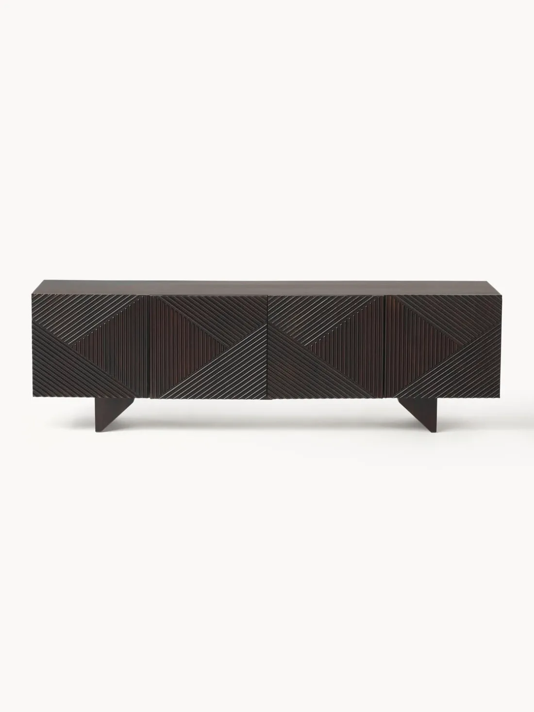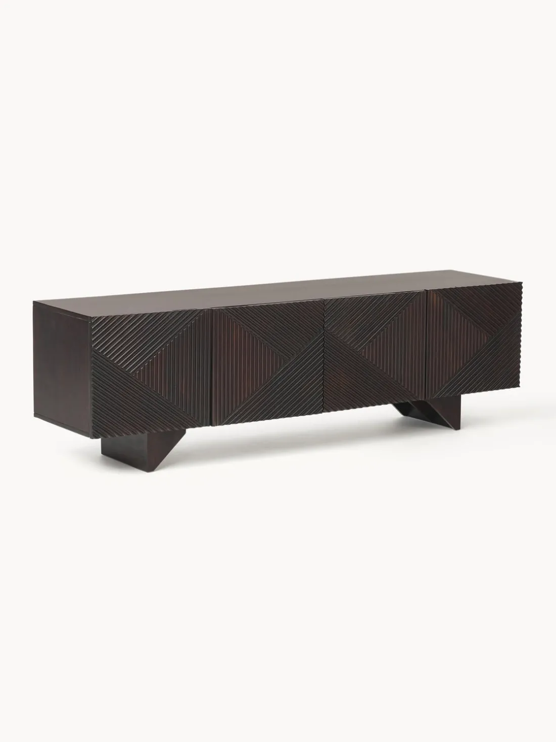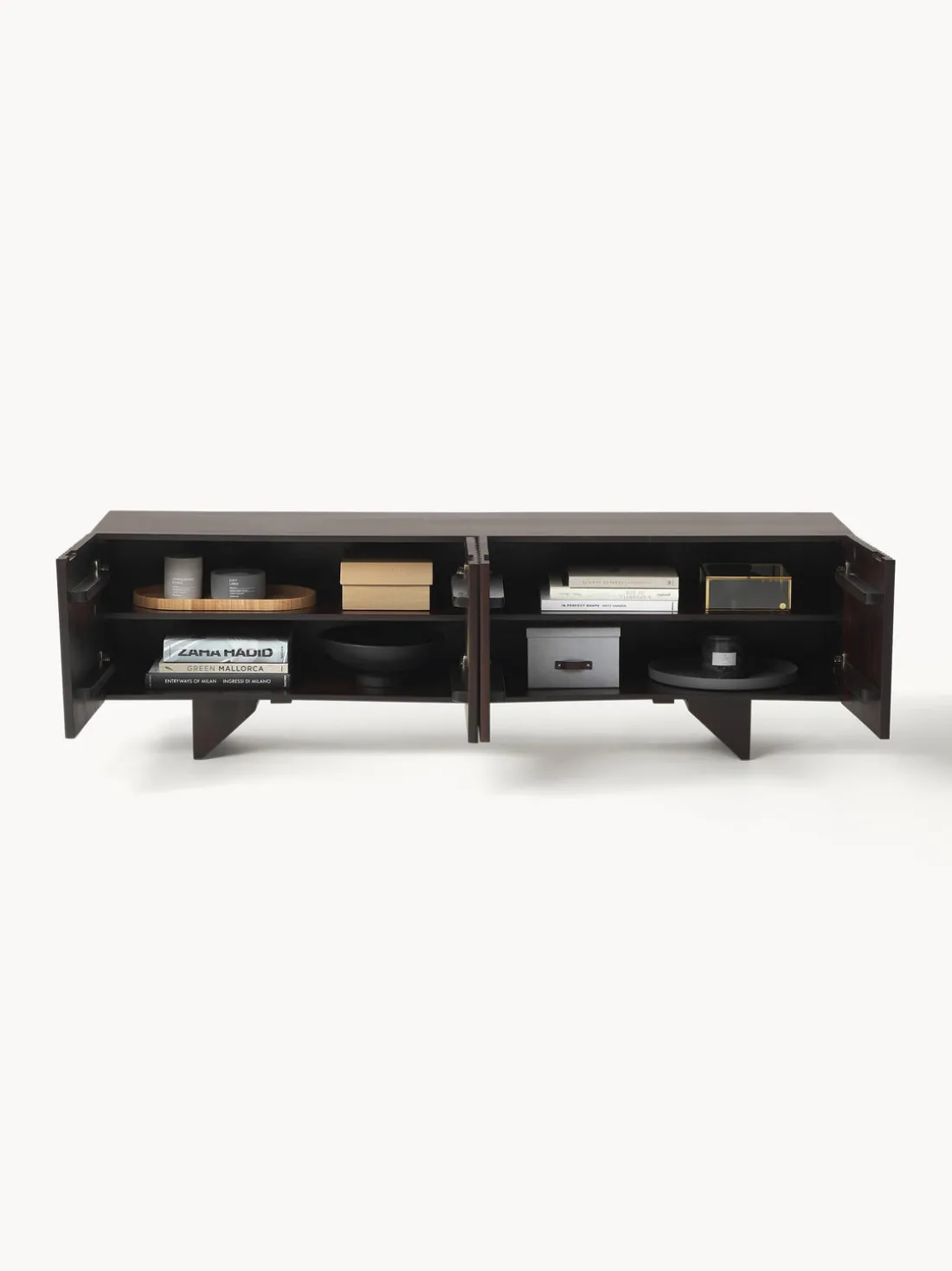 Este aparador tiene cuatro puertas, cuatro compartimentos y un pasacable en la parte trasera.