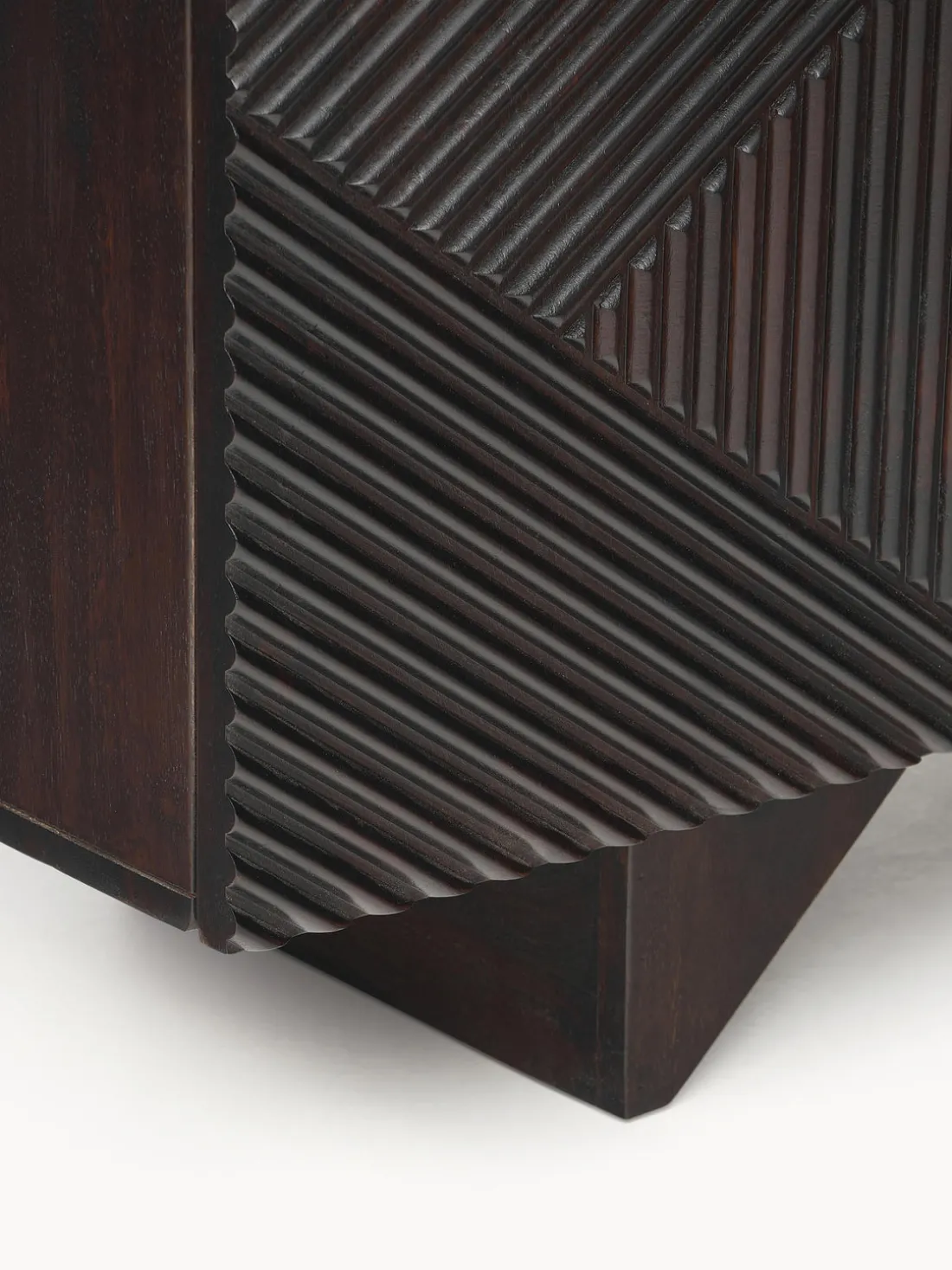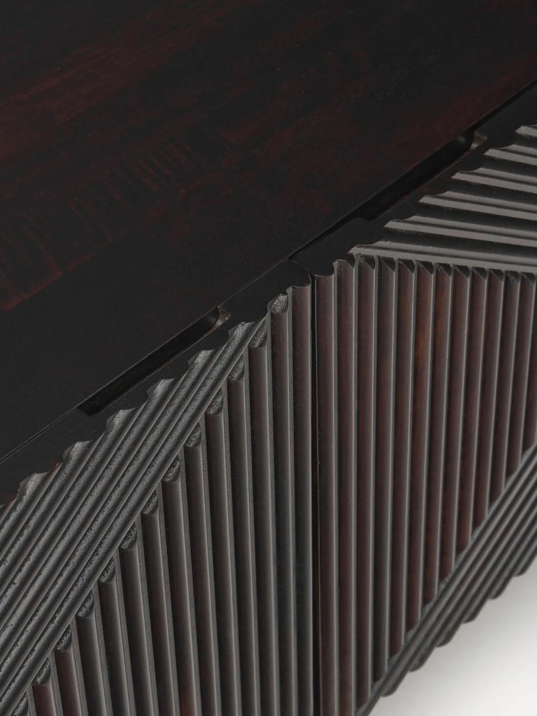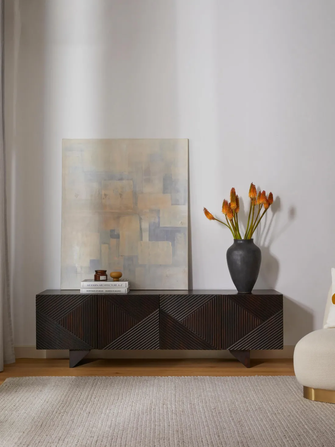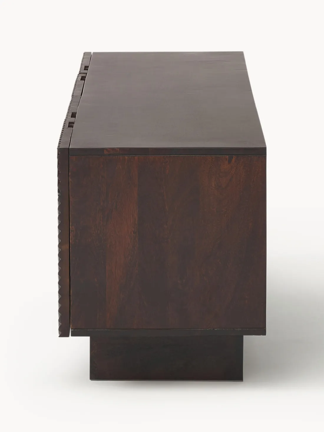 Este aparador tiene cuatro puertas, cuatro compartimentos y un pasacable en la parte trasera.