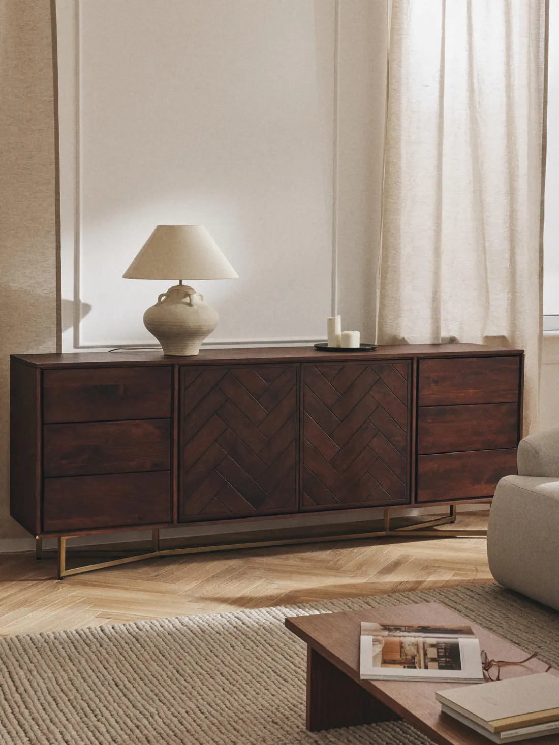 El aparador tiene 6 cajones y 2 compartimentos.