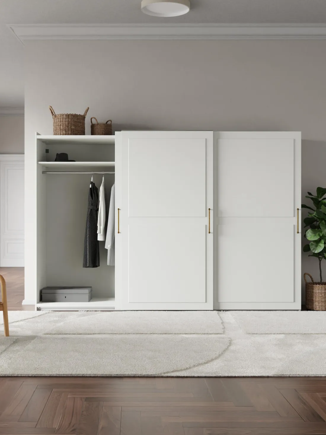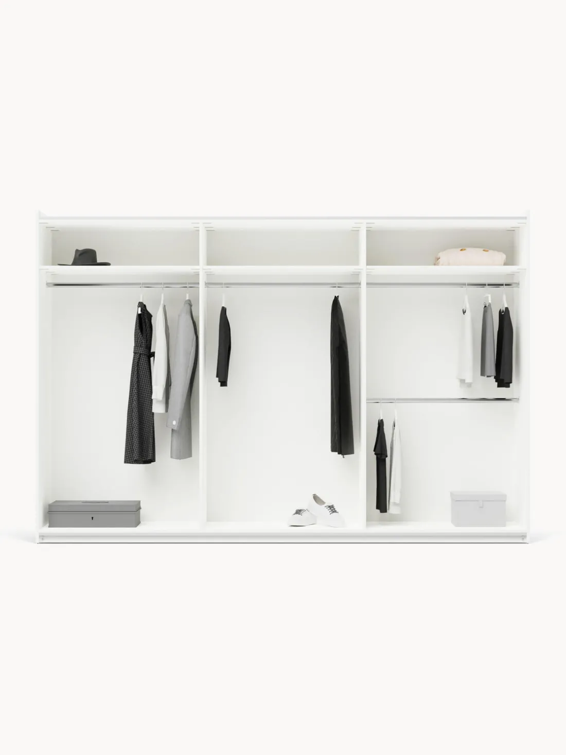 – Armario modular que consta de 3 módulos con diseño interior Basic que incluye 4 barras para colgar ropa y 3 estantes