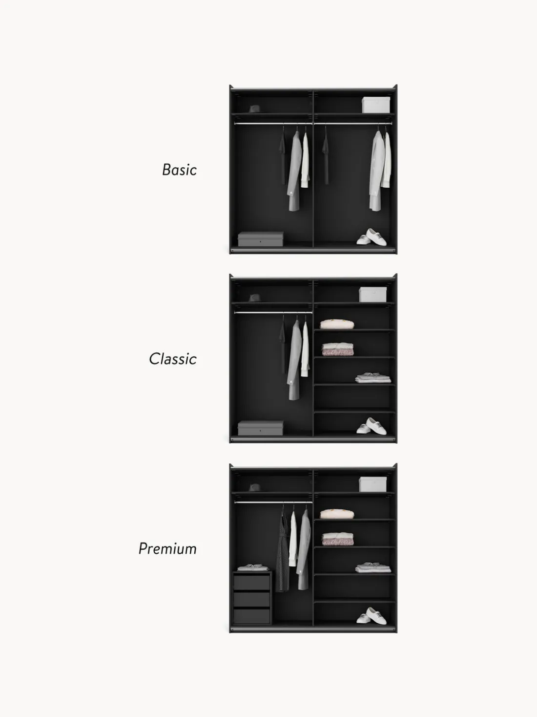 ¡Tu armario debe ser tan único como tu estilo! Nuestro armario Leon te ofrece tres interiores diferentes para que puedeas elegir cual te satisficace tus necesidades mejor: