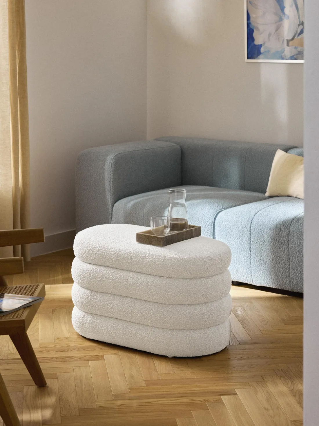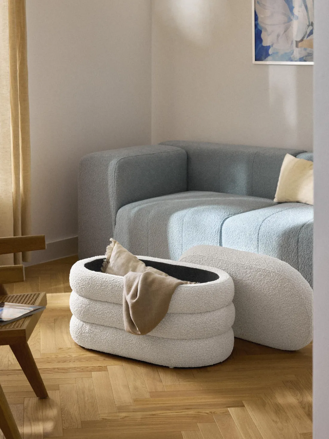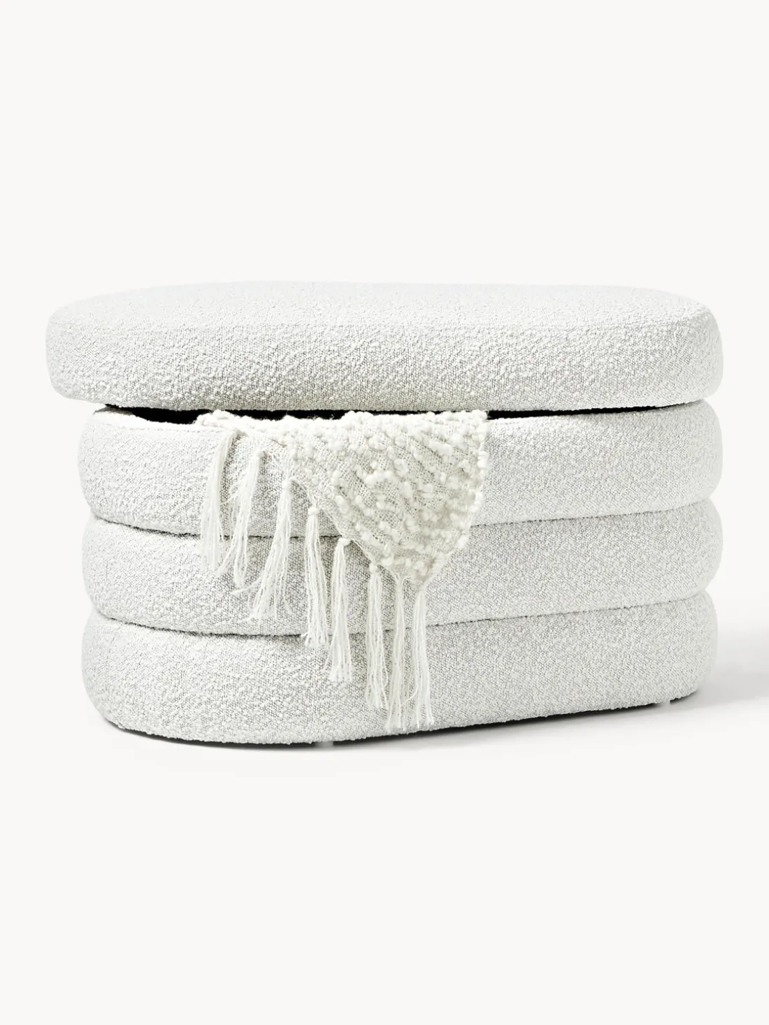 Banco pequeño tapizado en tejido bouclé con espacio de almacenamiento Alto