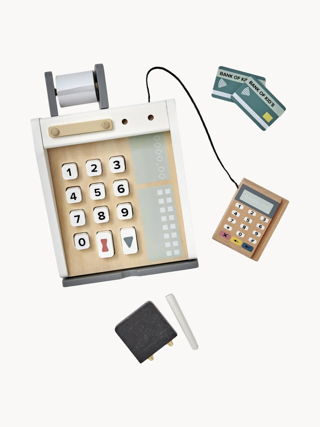 Perfecta para el pequeño quiosco o tienda. La caja registradora tiene pulsadores, una pizarra para anotar los precios, tiza blanca y compartimentos para billetes y monedas. También incluye un lector de tarjetas con dos tarjetas.