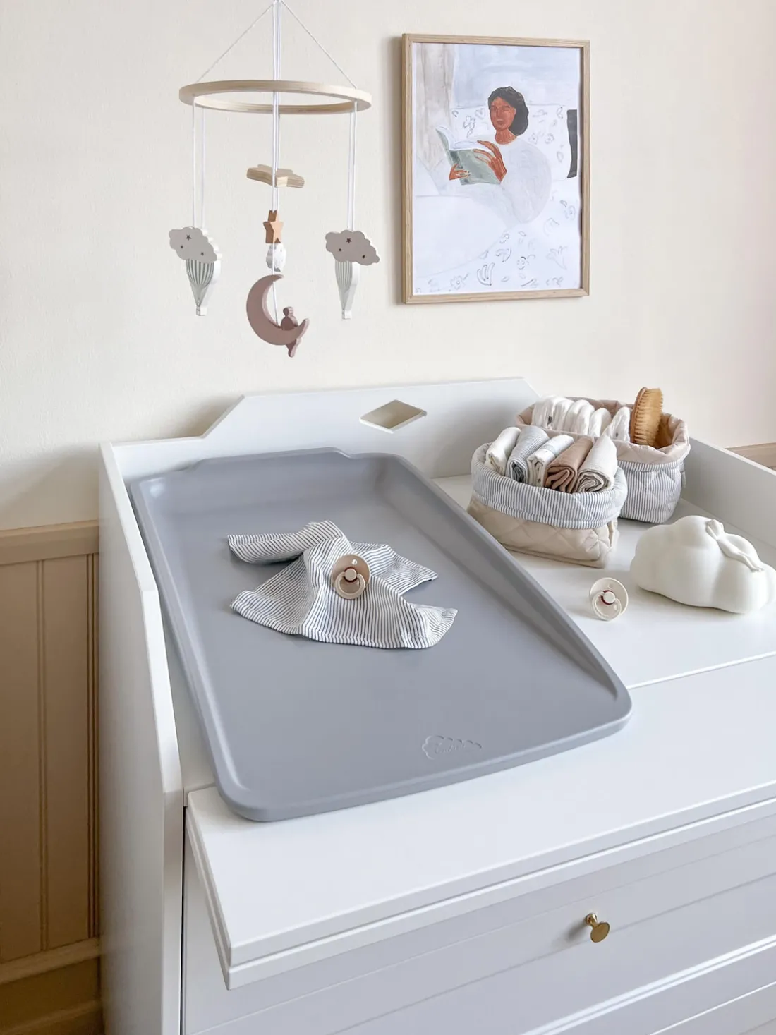 El cambiador es repelente al agua y fácil de limpiar y desinfectar, lo que facilita la vida diaria con un nuevo bebé en la familia. El cambiador se siente como la piel caliente y es muy seguro y cómodo para el bebé.