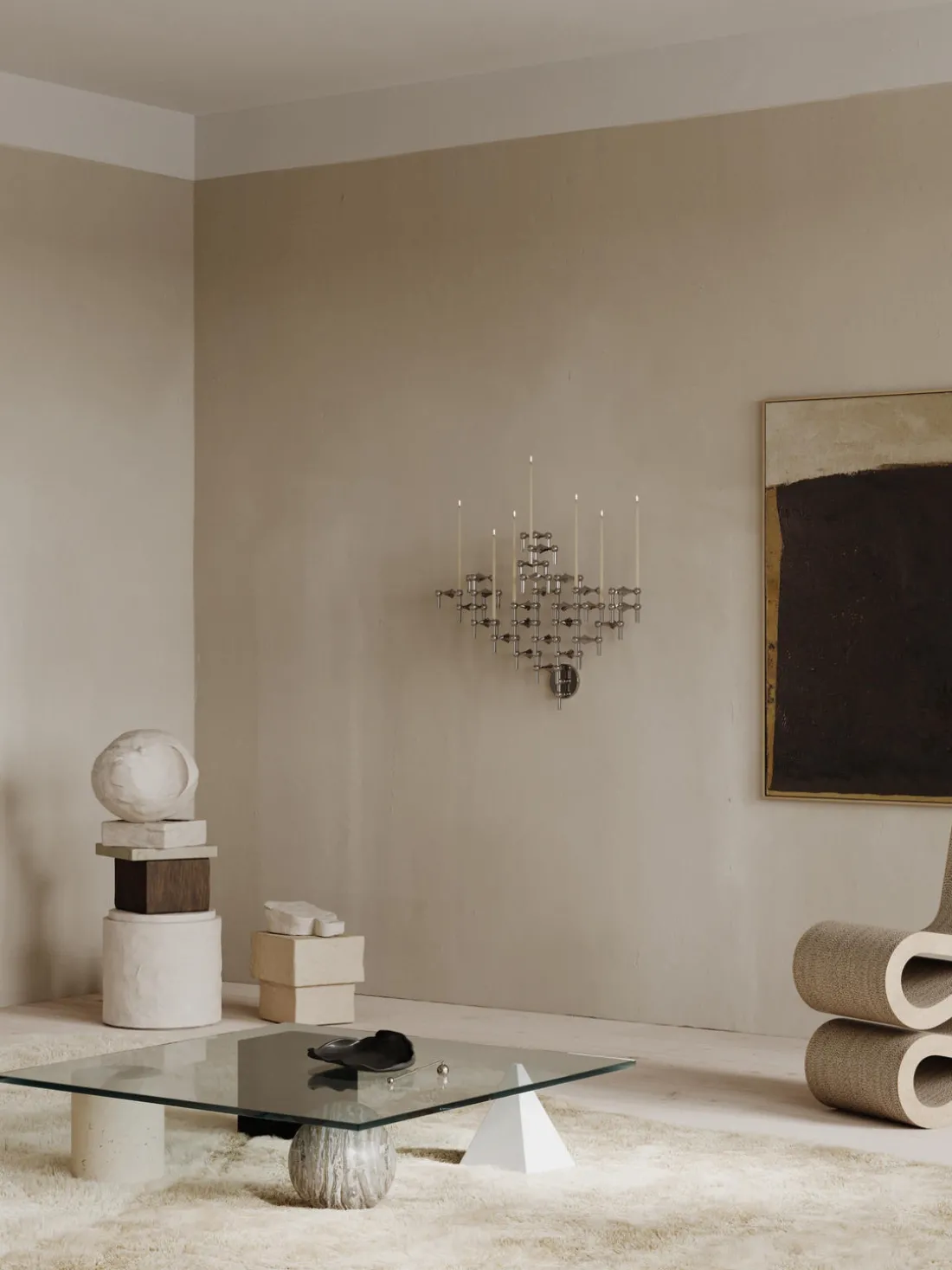 Construye tu escultura sobre la base de un soporte de pared con una colección de candelabros.