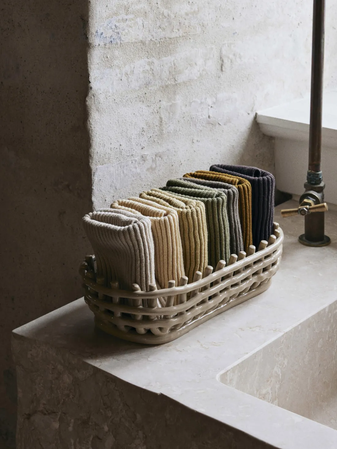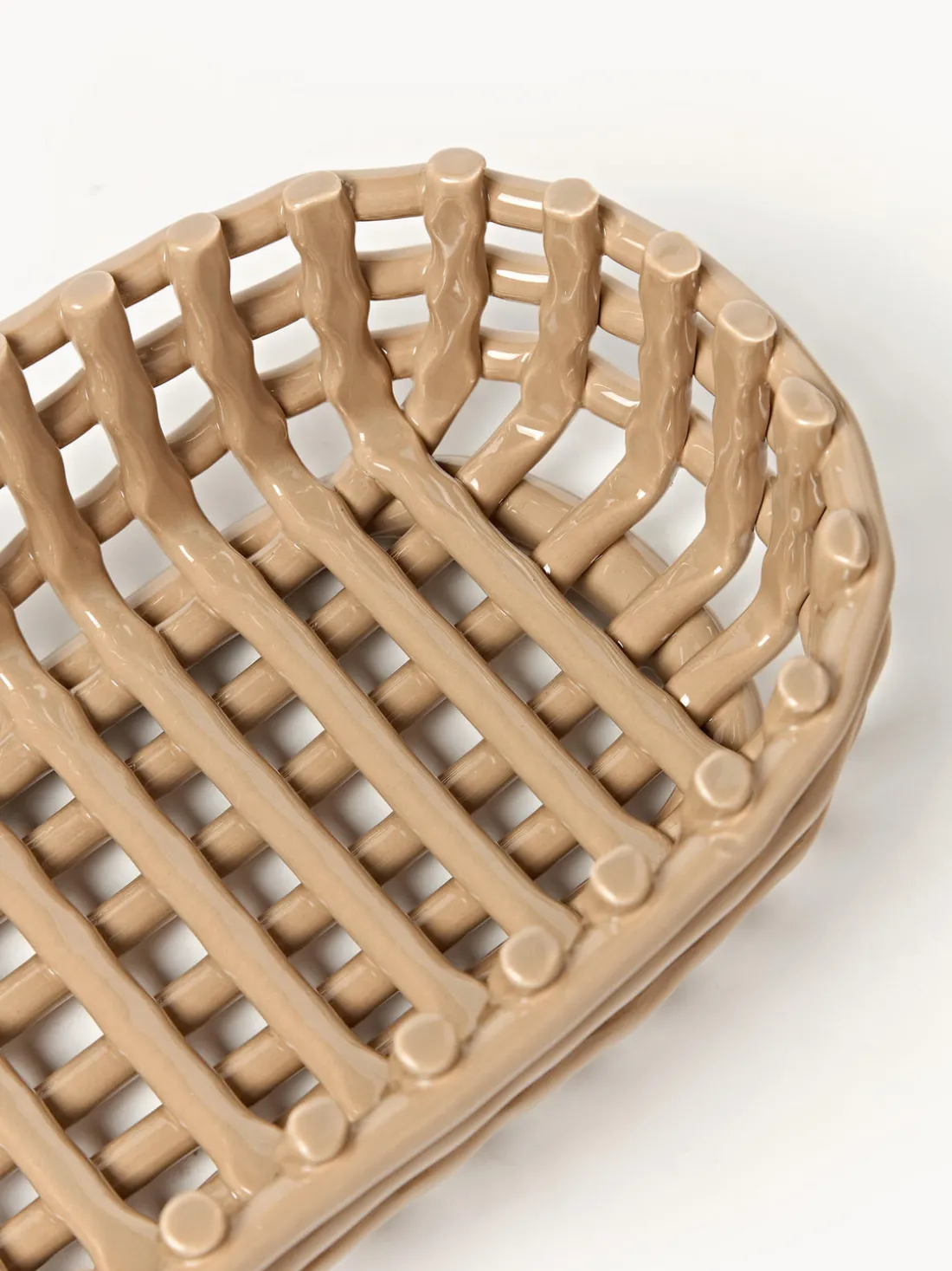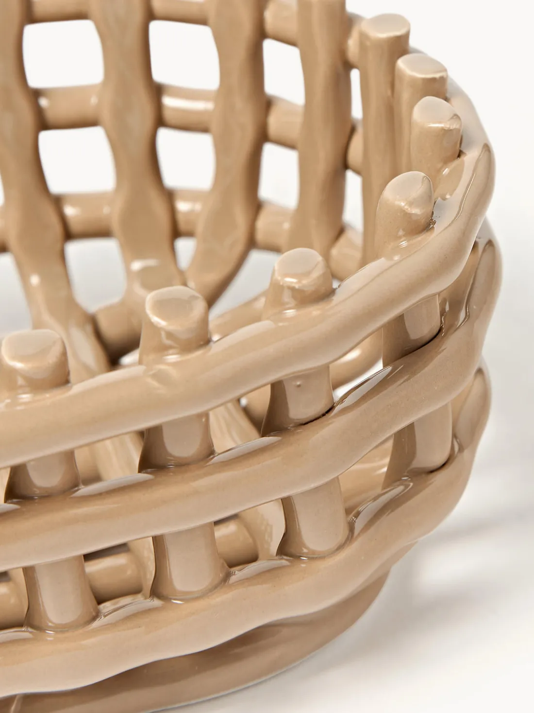 La cesta de almacenaje hecha a mano Nalan evoca la sensación familiar de los recipientes tejidos y traslada la cestería tradicional a la cerámica. Su diseño multifuncional puede utilizarse como macetero, frutero o centro decorativo de una habitación. Moldeada a mano y artísticamente irregular, cada cesta es única.