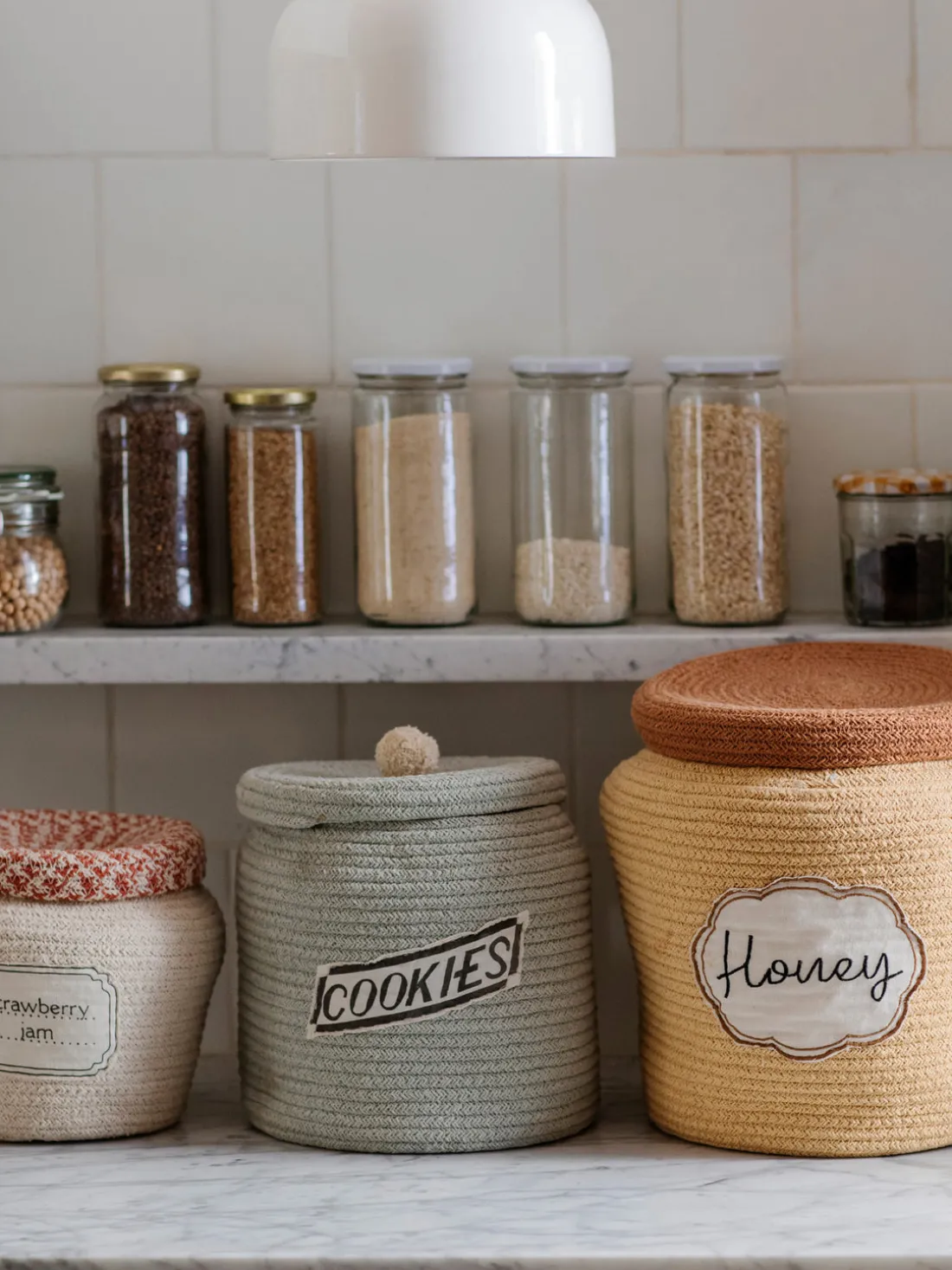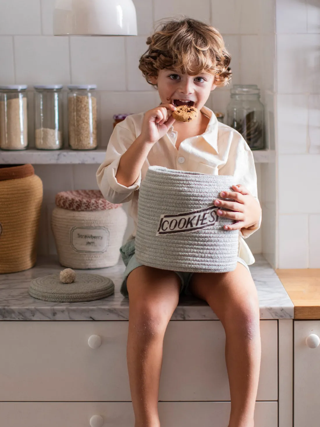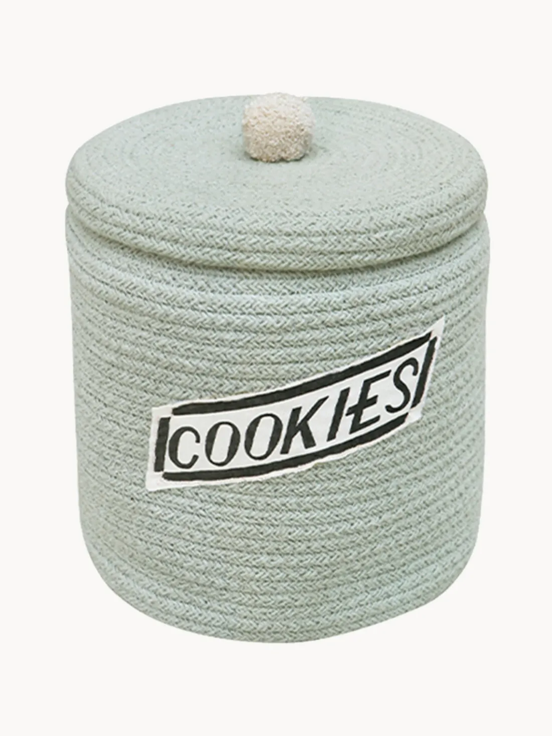 El sueño de tus peques: ¡una galleta llena de galletas! La cesta COOKIE JAR está hecha a mano con un cordón trenzado de fibras de botellas de PET recicladas mezcladas con algodón. La cesta tiene una etiqueta de tarro bordada con la palabra Cookies.