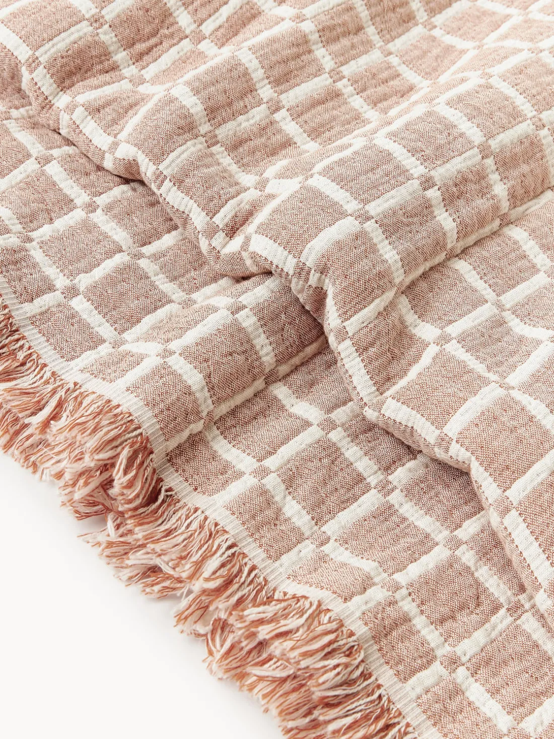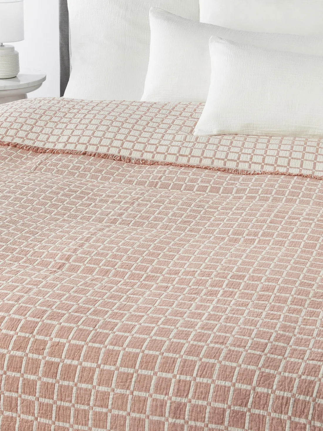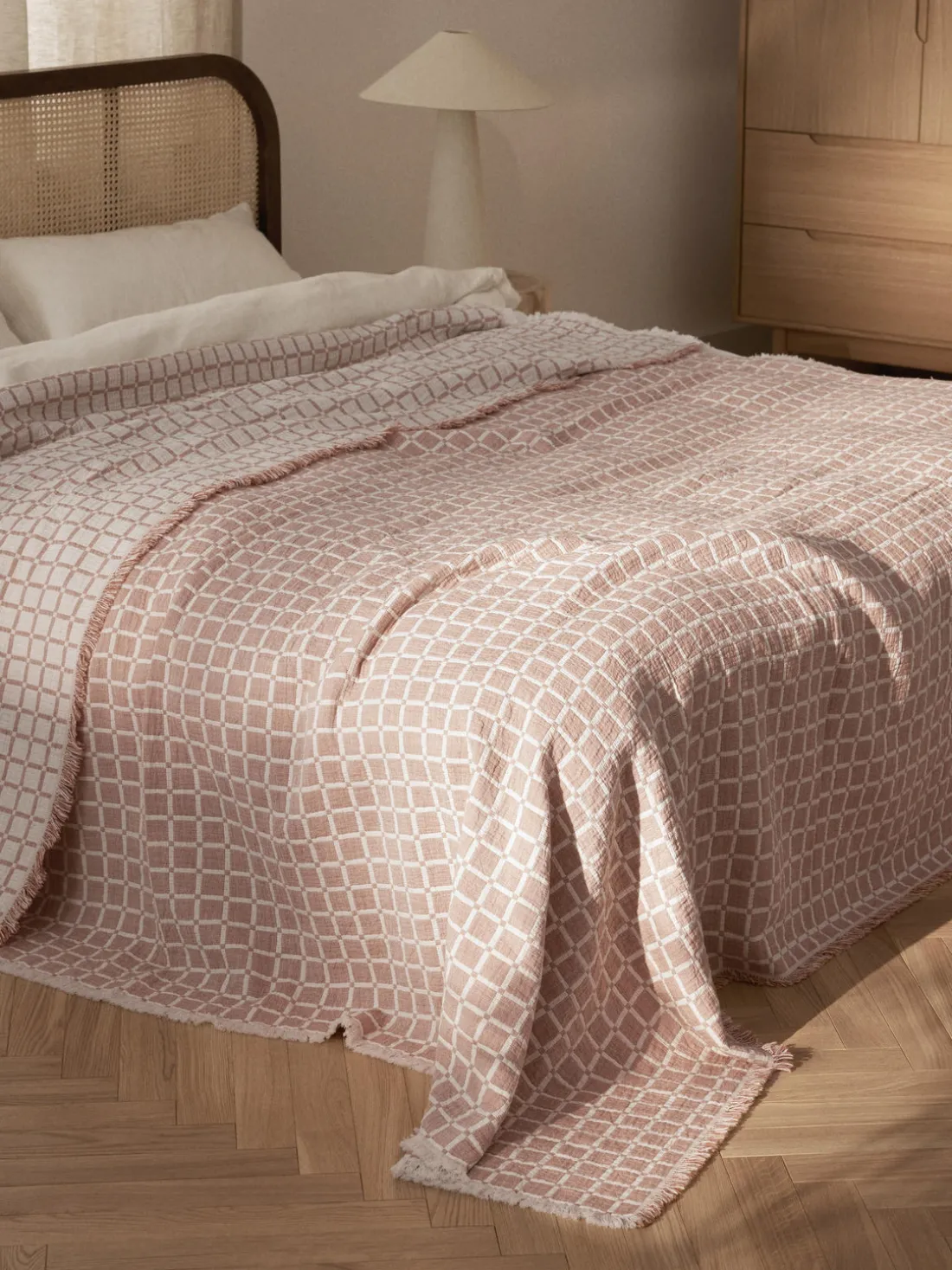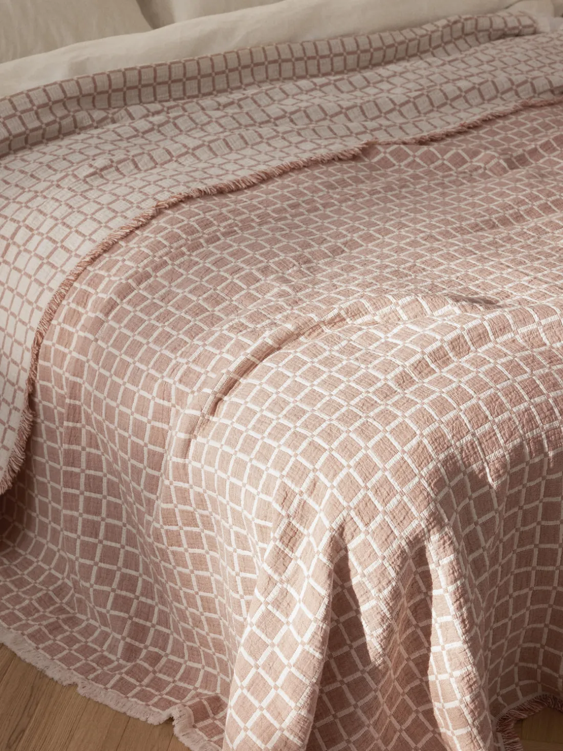Las colchas nunca deben comprarse demasiado pequeñas. Deben ser al menos iguales a la longitud y el ancho de la cama más unos 20 cm pora cada lado. Como resultado, cubren toda la cama y alcanzan el borde del colchón.