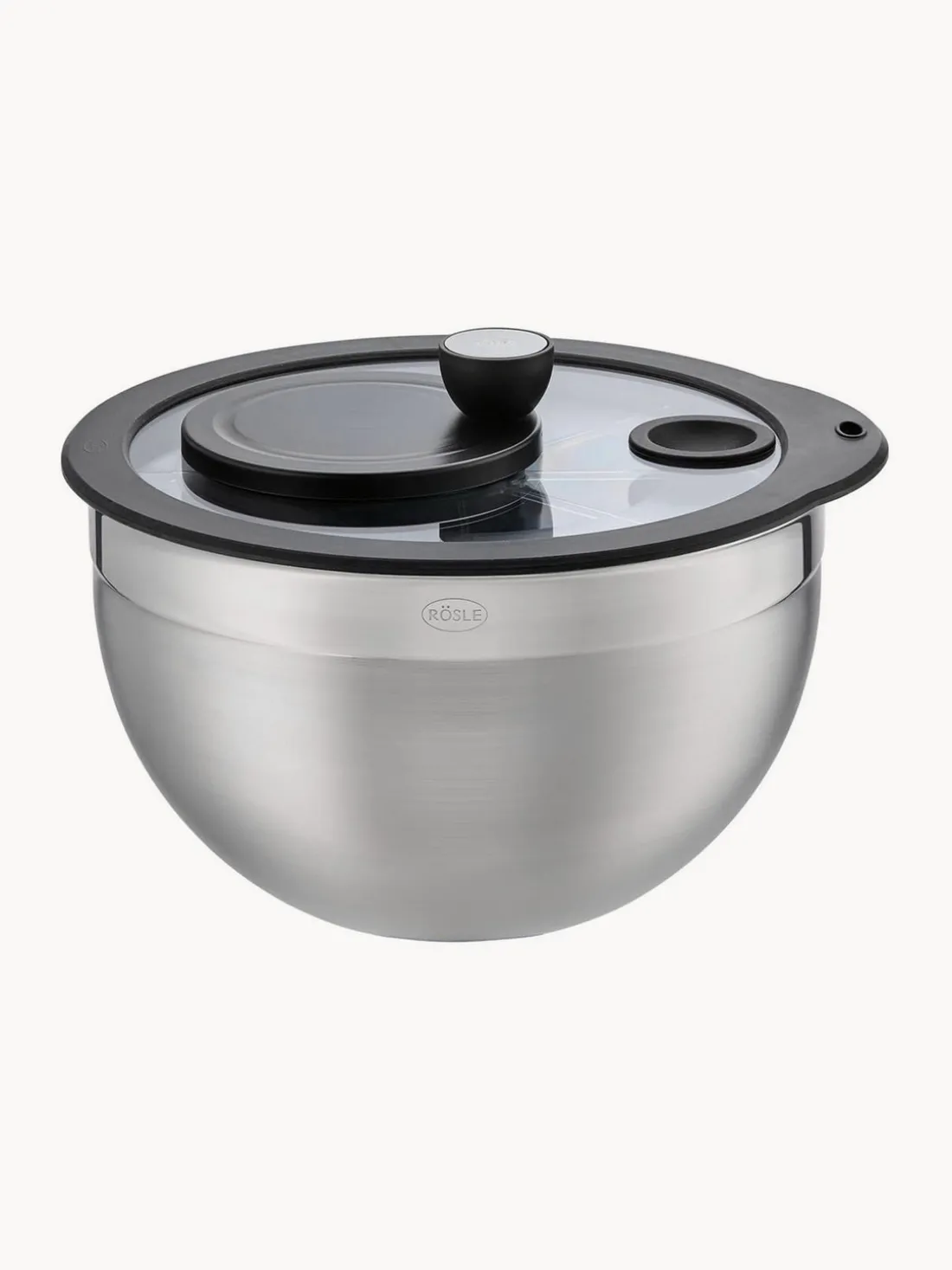 La centrifugadora de ensaladas consta del cuenco original de RÖSLE con tapa de vidrio templado, cesta y plato giratorio.