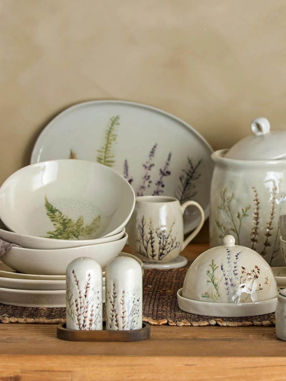 La serie BEA se caracteriza por un delicado diseño de césped pintado a mano y añade un toque personal a la decoración de tu mesa. El esmalte craquelado confiere a los productos una dimensión textural adicional, mientras que los detalles pintados a mano garantizan que cada pieza de la colección sea única.