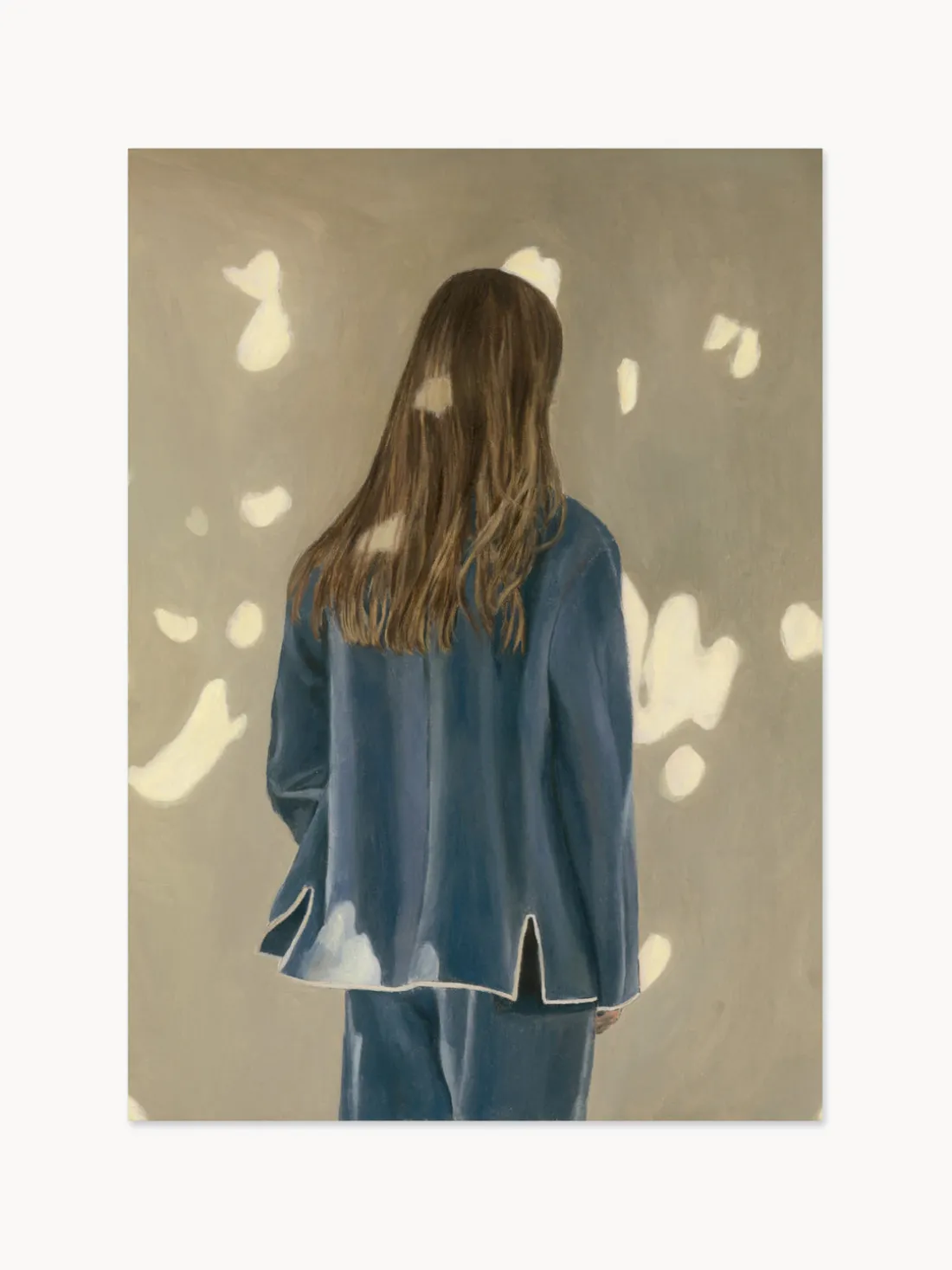 LIGHT AND SHADOW de la artista sueca Jonna Valtner expresa su capacidad para capturar momentos sutiles a través de texturas ricas y colores suaves. Una figura solitaria vestida de azul se encuentra en la escena mientras la luz moteada se derrama sobre ella, añadiendo una dinámica gráfica a la composición.