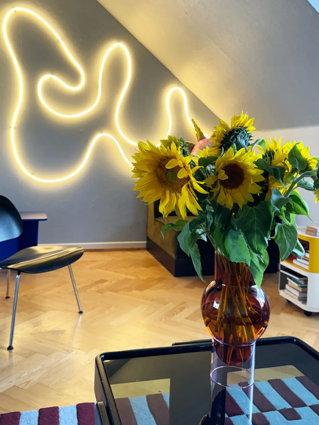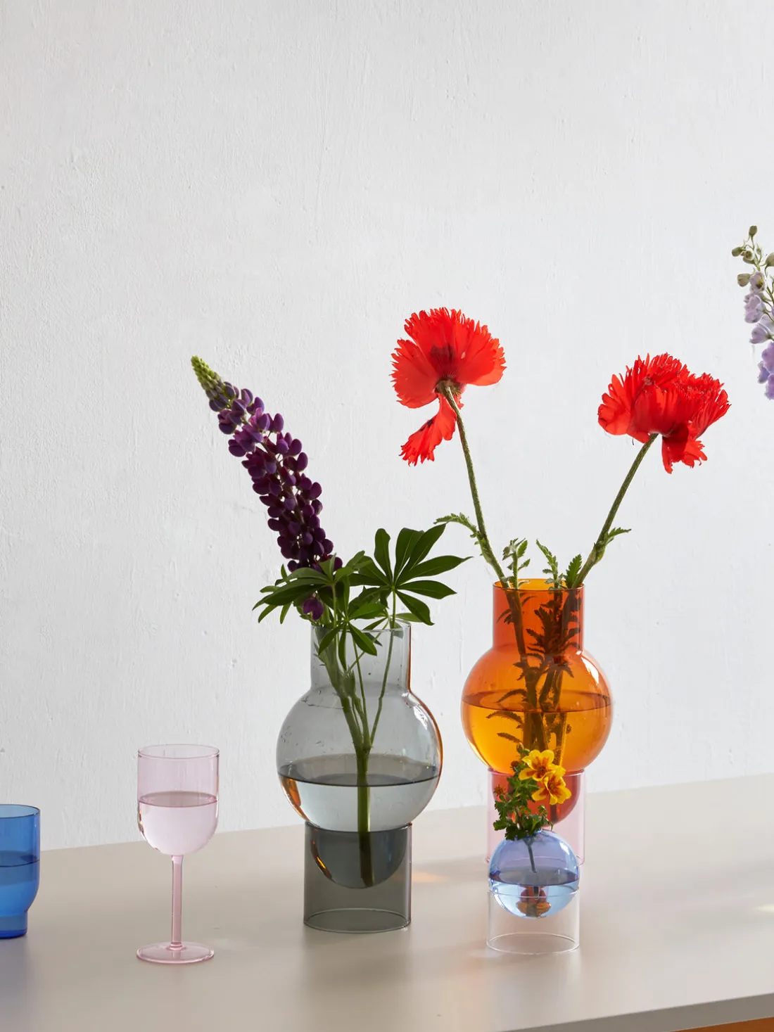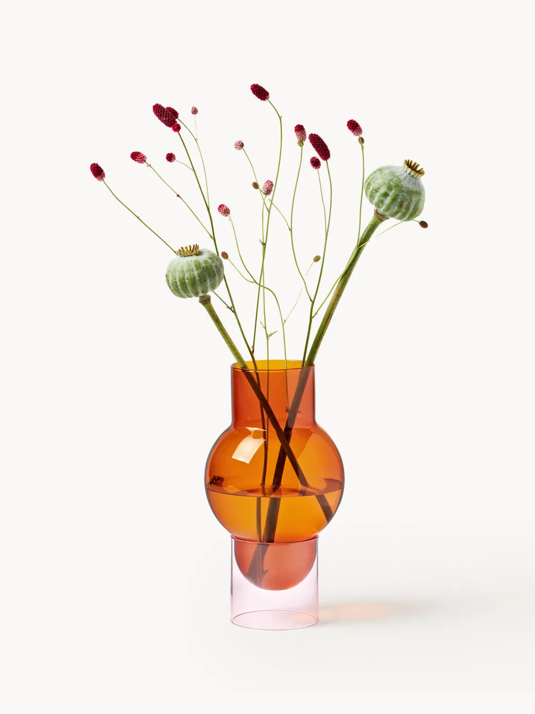 BUBBLE es un gran jarrón de vidrio de dos piezas con un aspecto flotante y elegante. El jarrón de tono ámbar se apoya sobre una base cilíndrica rosa, creando una expresión tranquila pero llamativa. Úselo con o sin flores y experimente con la luz, el agua y la sombra en su decoración. Un diseño clásico de Studio About que juega con las formas, la simplicidad y el estilo: hermoso por sí solo o lleno de vibrantes flores.