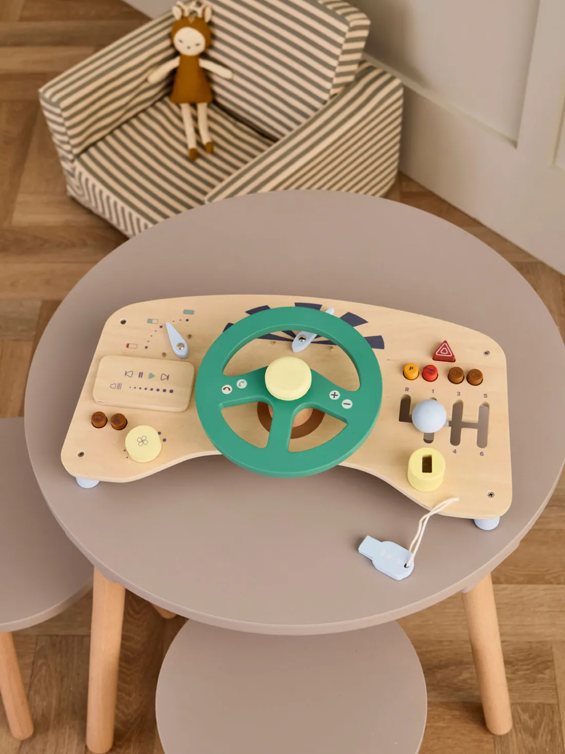 ¡Listos, listos, listos para conducir! Este tablero de actividades de conducción de madera permite que su hijo tome el volante y explore la diversión de conducir su propio “coche”. Con un volante para girar, un “GPS” para seguir las direcciones y una llave para arrancar el motor, los pequeños conductores disfrutarán de un emocionante viaje. El tablero también cuenta con un claxon en el volante, botones pulsadores, un velocímetro y un indicador de nivel de batería, creando una experiencia de conducción inmersiva. Y como se trata de un coche eléctrico, no es necesario repostar gasolina, ¡sólo mucha diversión!