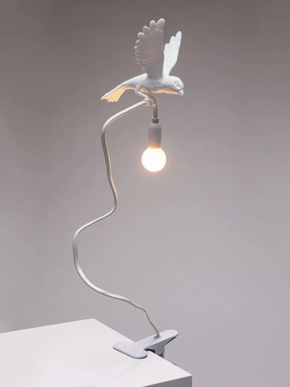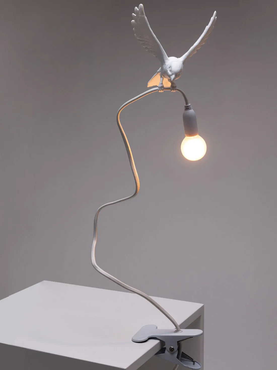 La lámpara Sparrow es un producto de la marca Seletti, conocida por sus inusuales soluciones de diseño de interiores. La lámpara de sobremesa Sparrow está equipada con un clip que se sujeta al escritorio.