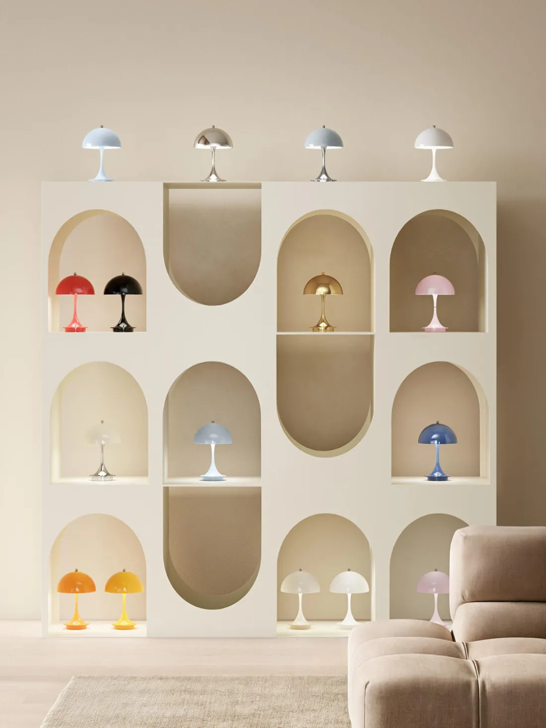 La PANTHELLA fue diseñada en 1971 por Verner Panton en colaboración con Louis Poulsen. Su inusual diseño no sólo refleja el estilo lúdico de Panton, sino que también proporciona una luz única y agradable gracias a sus formas orgánicas. La pantalla semiesférica emite la mayor parte de la luz hacia abajo, donde se refleja en la base en forma de trompeta y baña el entorno con una luz suave y difusa.