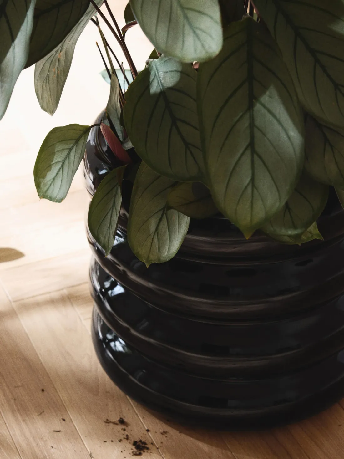 La maceta con platillo es ideal para evitar manchas de agua y permitir un riego uniforme.
