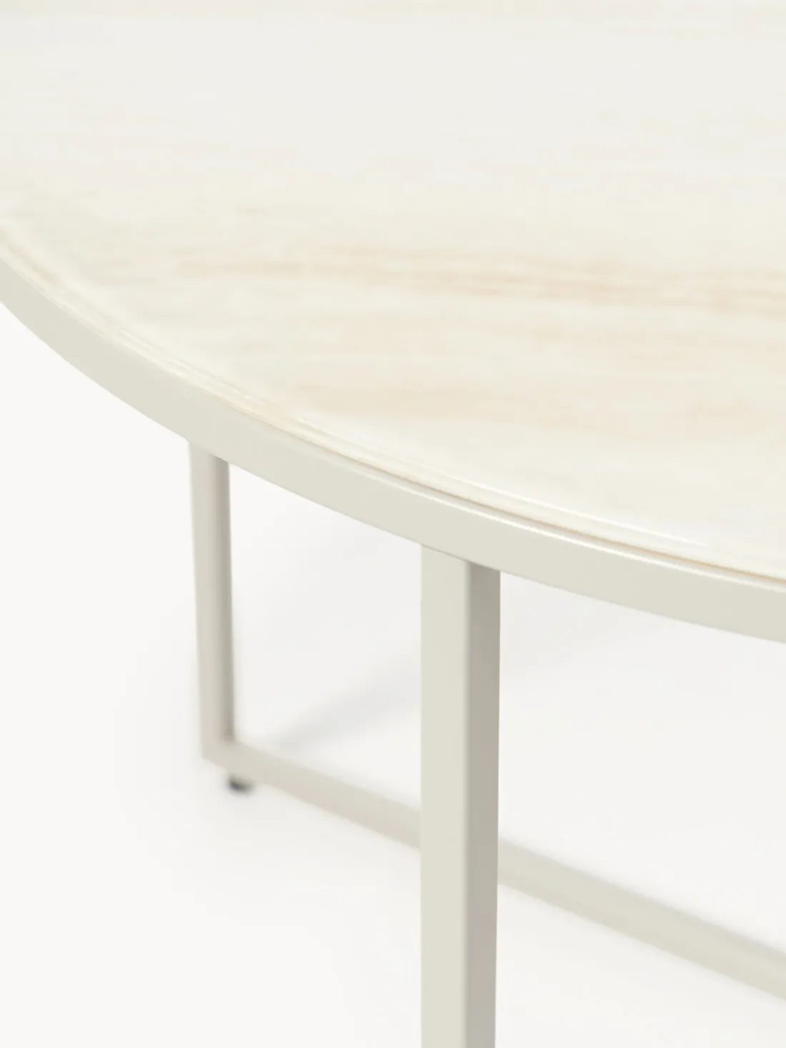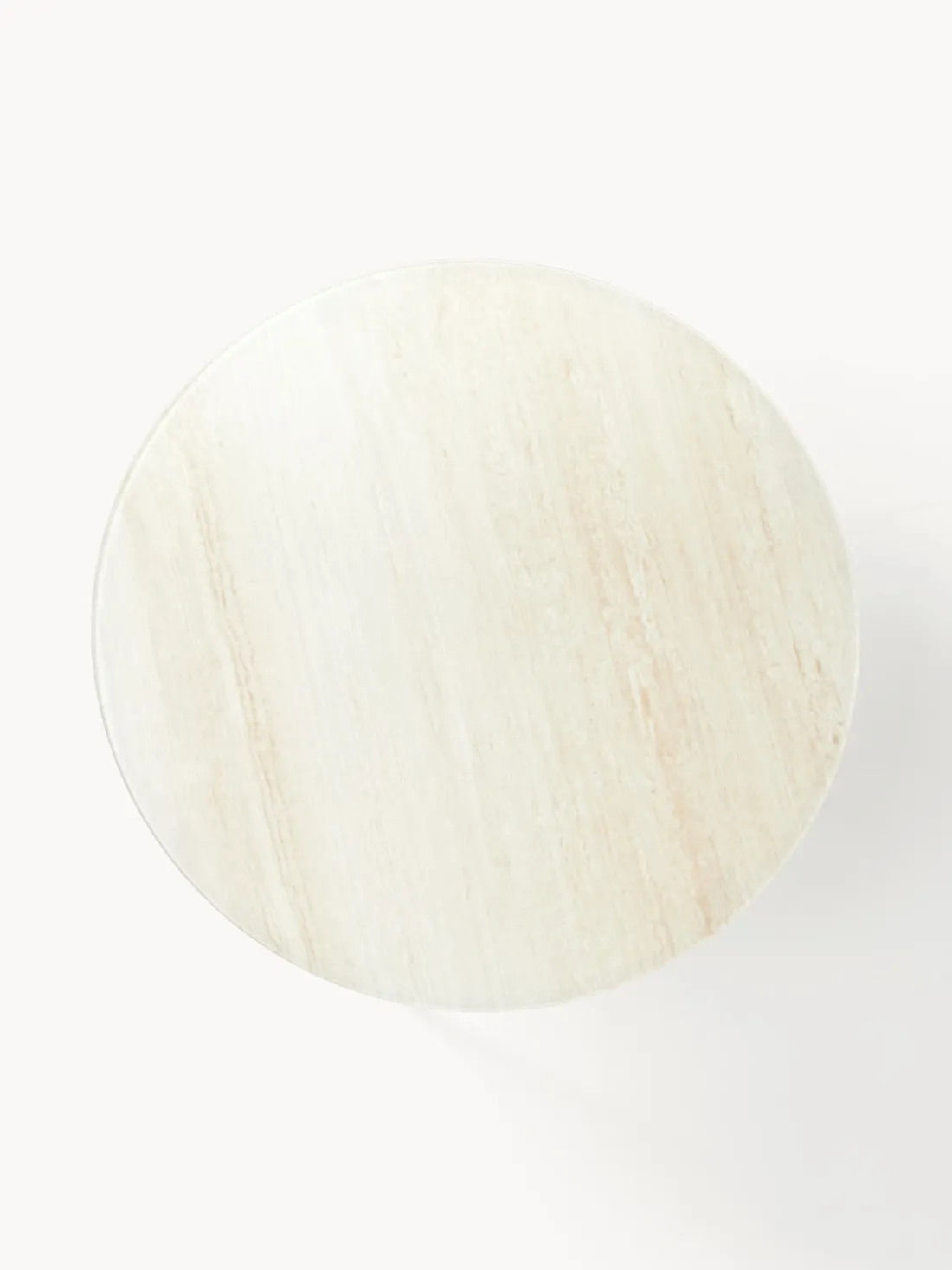 La mesa de centro redonda Antigua con tablero de vidrio en look travertino combina un diseño elegante y materiales de alta calidad para crear un elemento llamativo y atemporal en tu sala de estar. La tapa de vidrio imitación mármol le da a la mesa un toque noble y representa lujo y sofisticación, añadiendo un toque de opulencia a tu hogar.