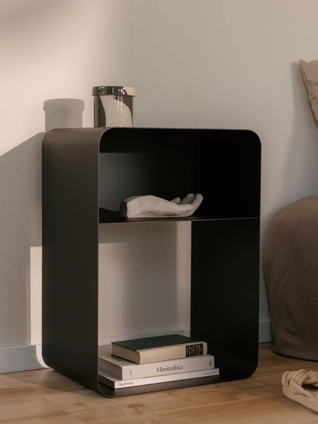 La mesita de noche tiene un compartimento.