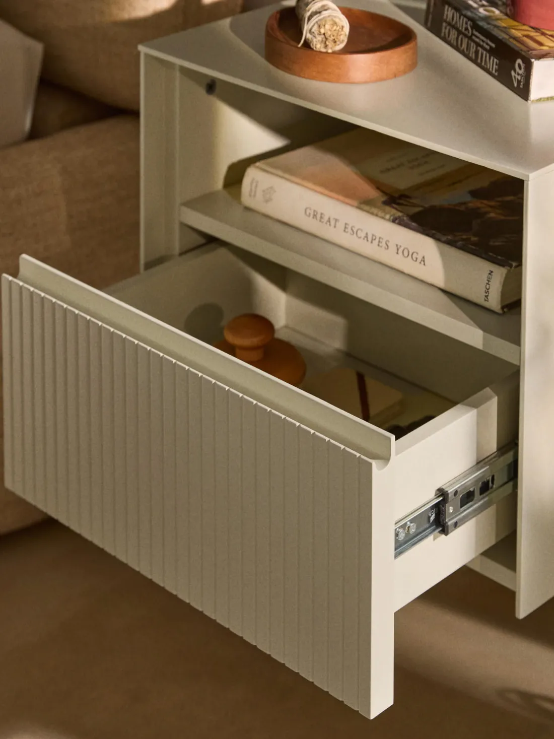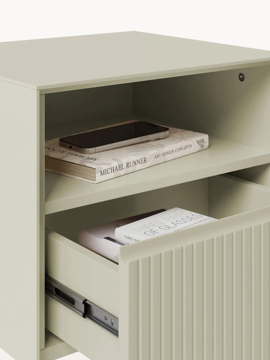 El cajón tiene un mecanismo con sistema Soft-Close (cierre ralentizado) y, por lo tanto, se cierra silenciosamente.