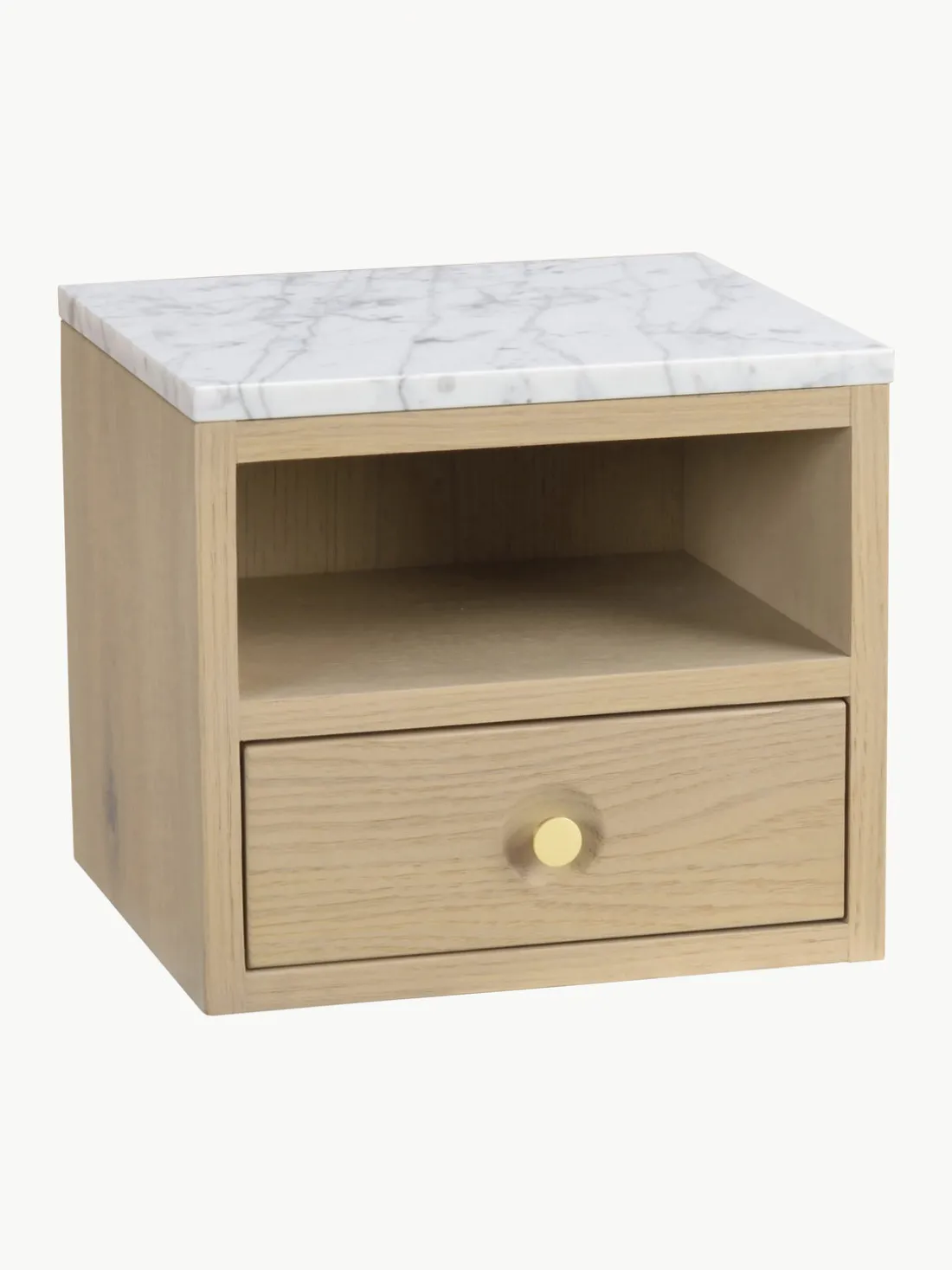 La mesita de noche tiene un cajón y un compartimento.