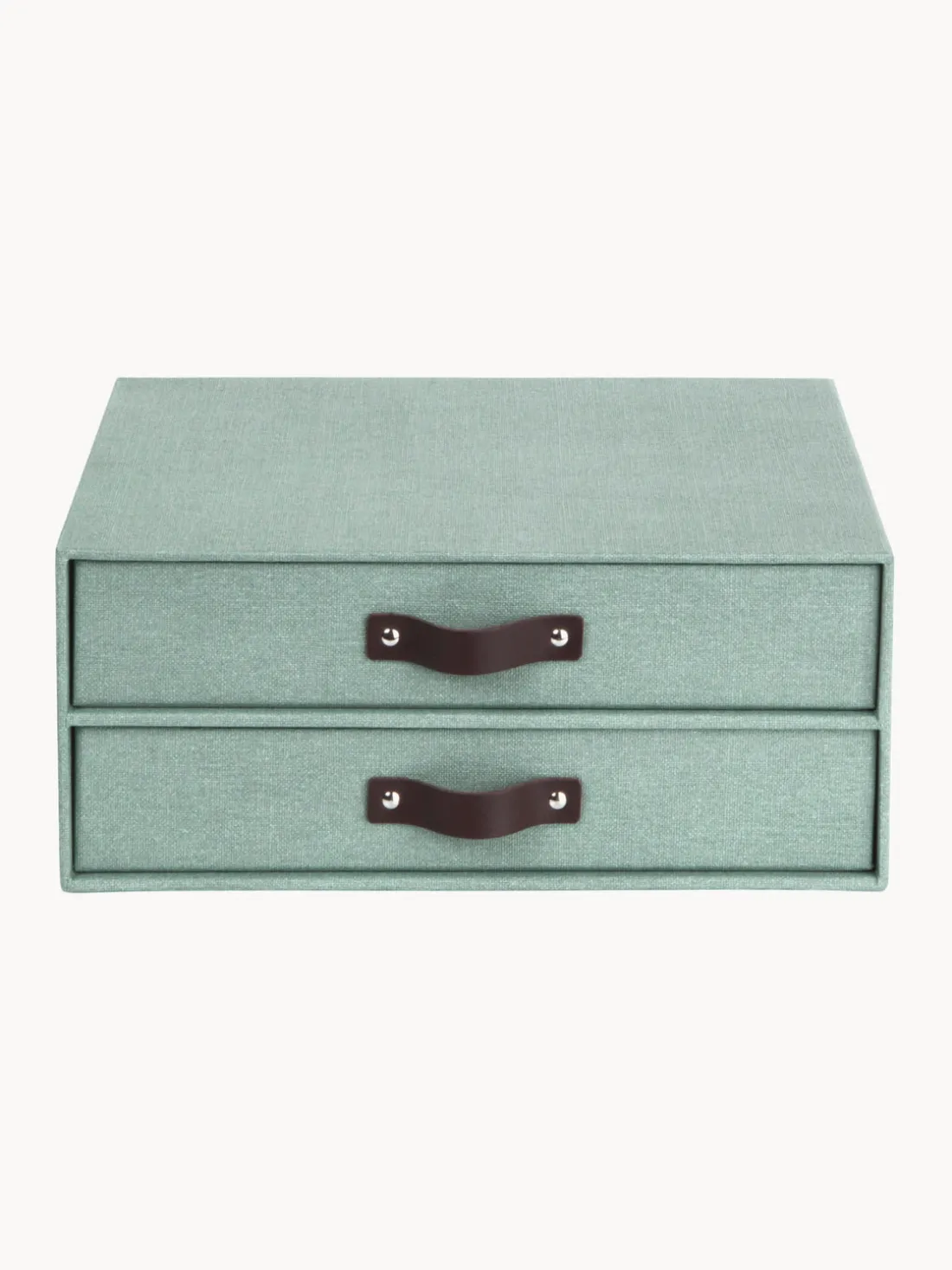 Organizador con dos cajones extraíbles con tiradores de cuero y antideslizantes de goma en la base para mantener orden en tu escritorio. Adecuada para el almacenamiento de documentos de formato DIN A4.
