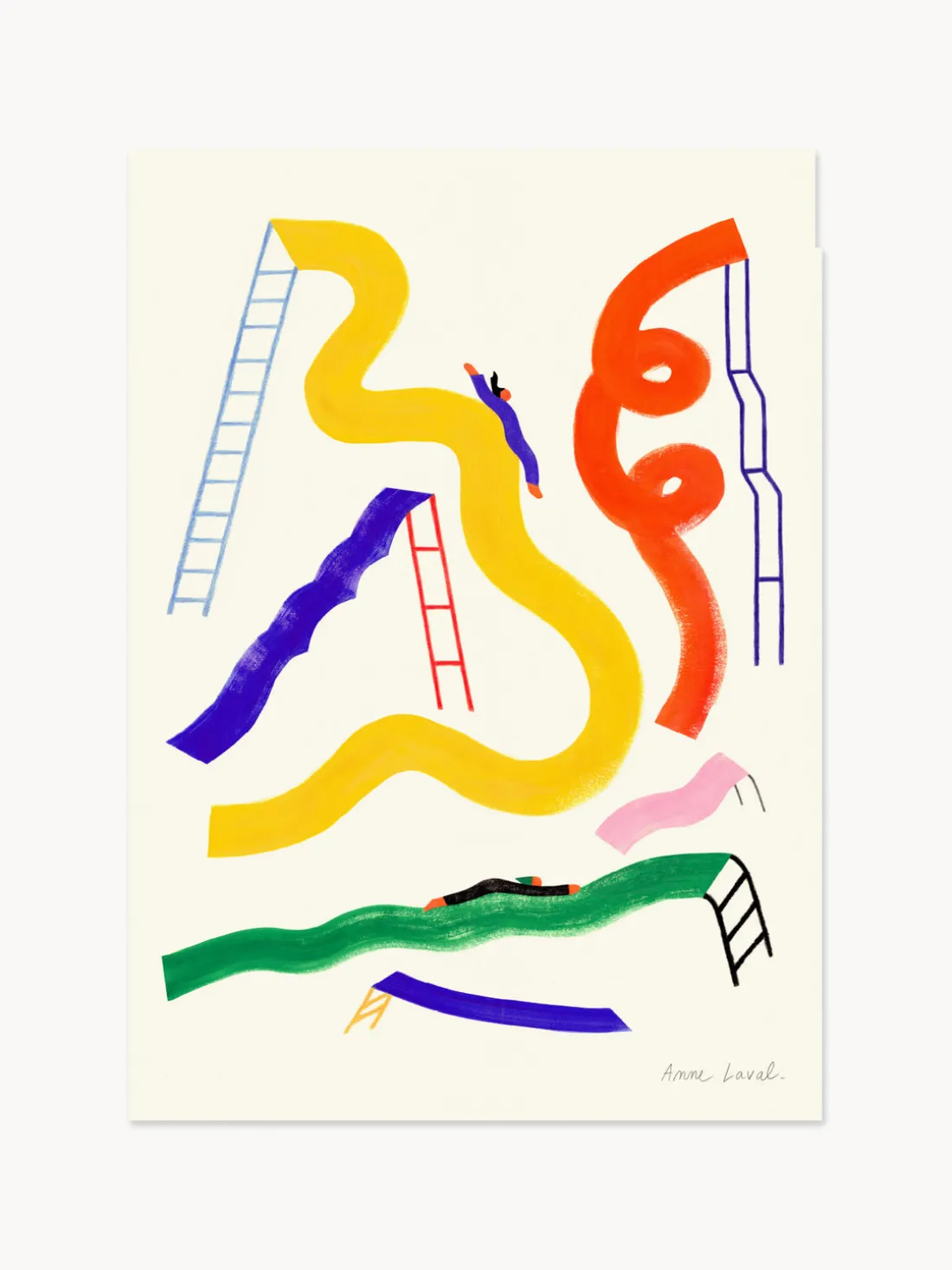 GLISSER, de la artista francesa Anne Laval, celebra el humilde tobogán. Retorcido, ondulado, bacheado o recto, cada tobogán es una nueva aventura. Creada con una mezcla de gouache estampado a mano y líneas de pastel, la composición te invita a un mundo de pura alegría.