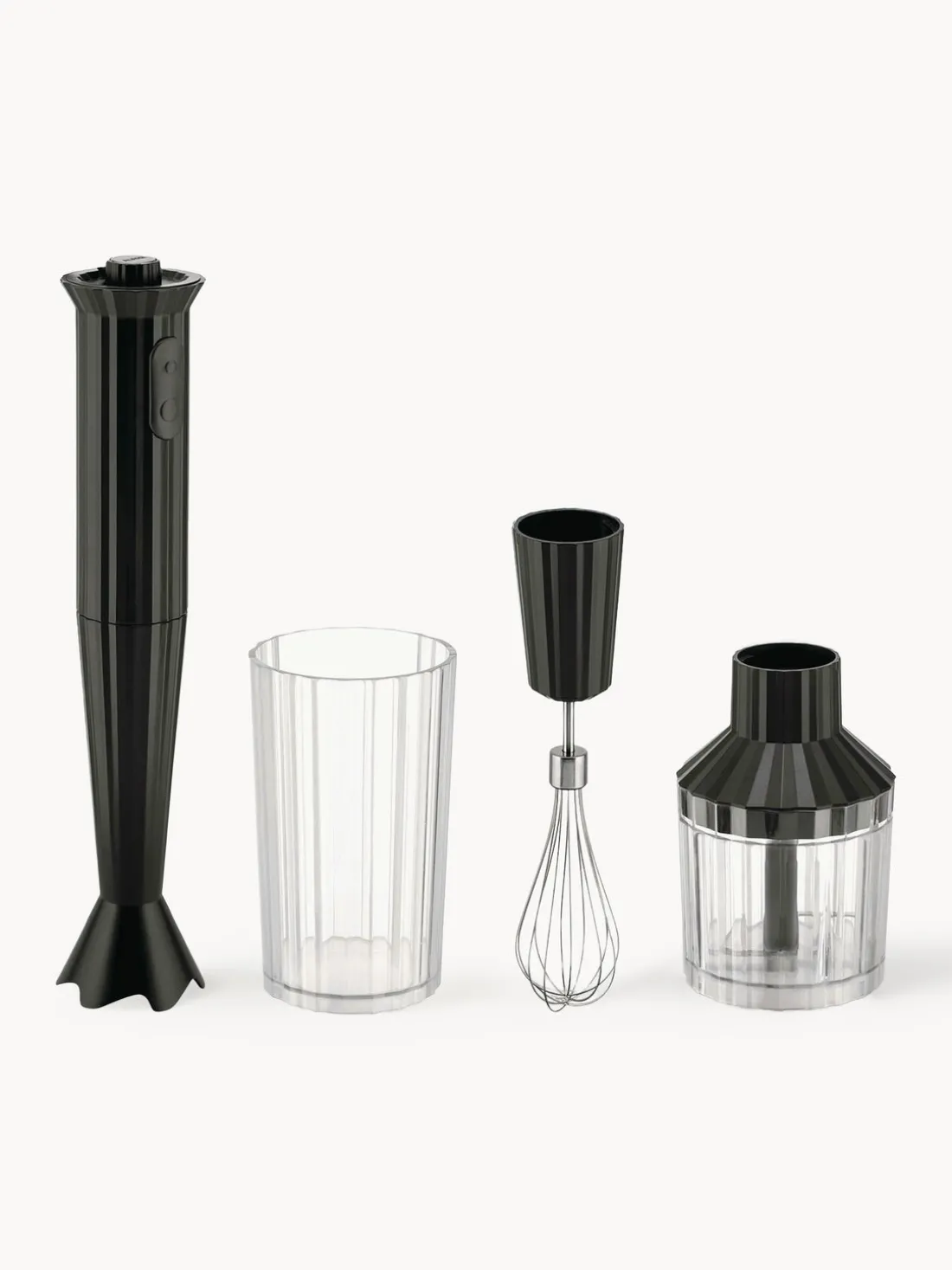 El set consta de una batidora de mano, un recipiente, un batidor y una picadora.