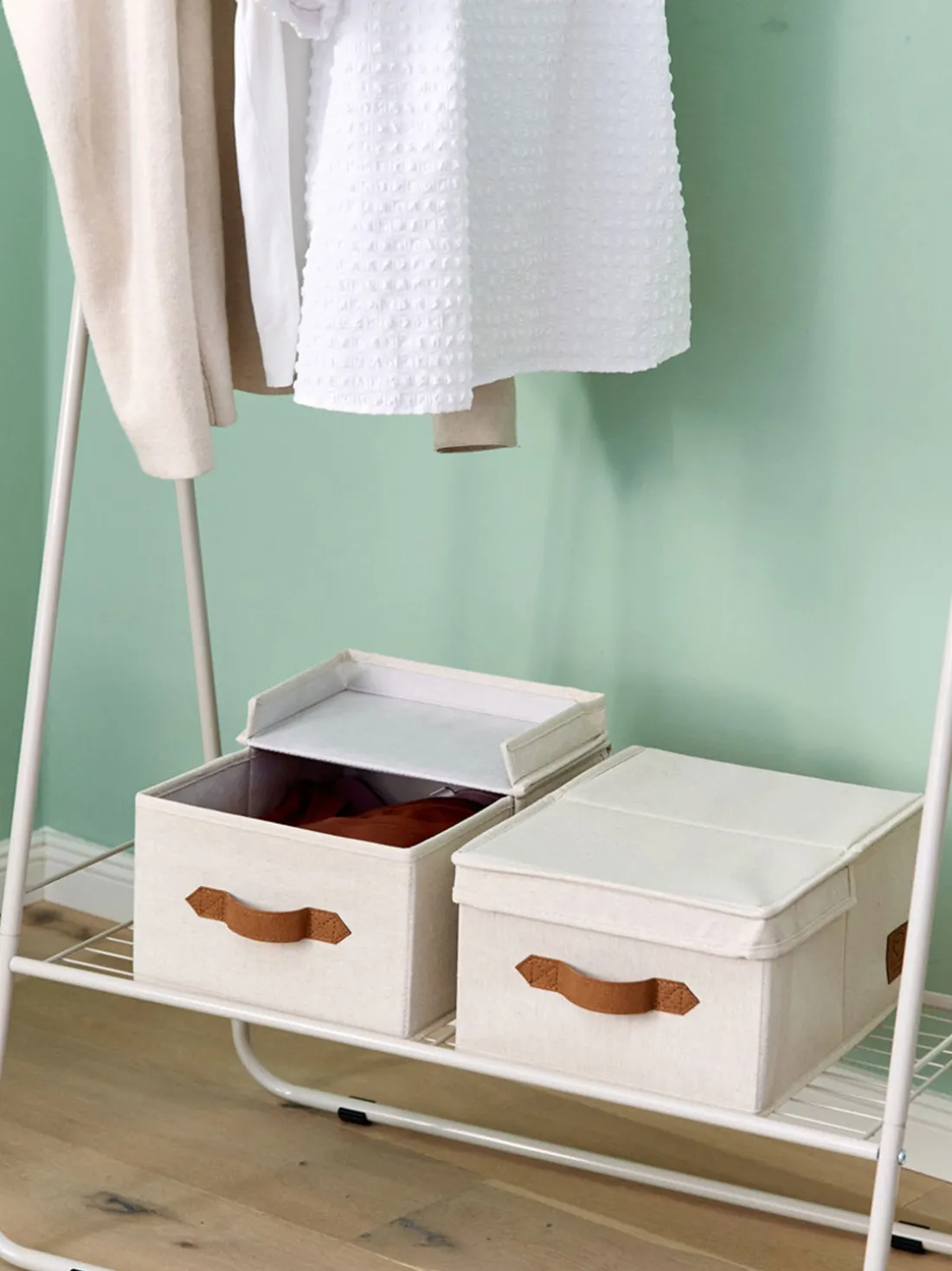 Las dos cajas de almacenaje con tapa abatible de la serie PREMIUM ofrecen una práctica solución de almacenaje para cualquier salón, dormitorio o espacio de trabajo. Las cajas de almacenaje ofrecen mucho espacio para ropa, juguetes, accesorios y mucho más. Las cajas de almacenaje están reforzadas con cartón en los laterales y en la tapa. Se han añadido asas en la parte delantera y trasera de la caja para facilitar su transporte. La práctica tapa abatible cosida en un lateral facilita la apertura y el acceso a los objetos. Los materiales utilizados y la alta calidad de fabricación de los productos hacen que las cajas sean robustas y duraderas. El tejido de lino de la tapicería se ha desarrollado especialmente para esta serie y convence con su hermosa textura y tacto. El logotipo de la marca Store It y las asas están hechos de fino cuero textil.