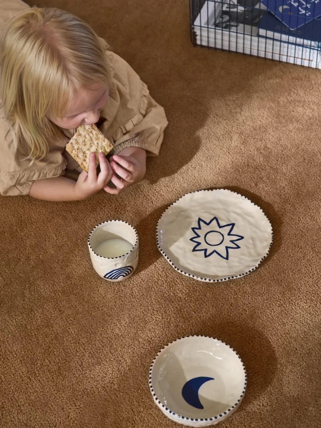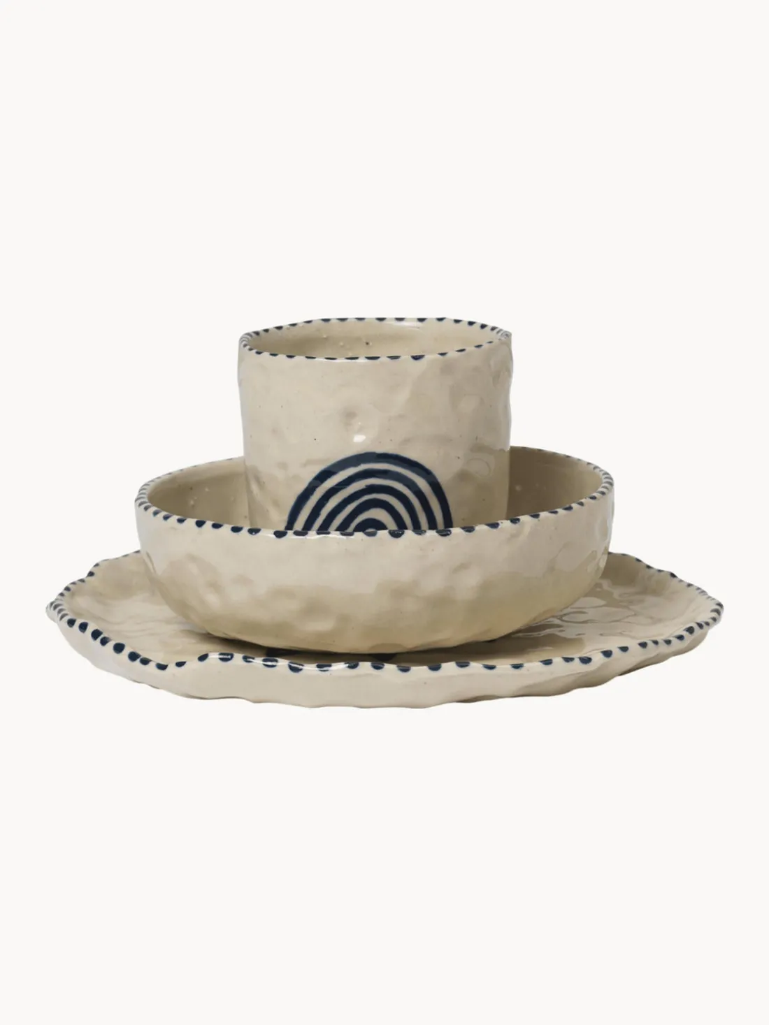 Este set de vajilla infantil de 3 piezas pintado a mano se compone de un plato, un bol y una taza.