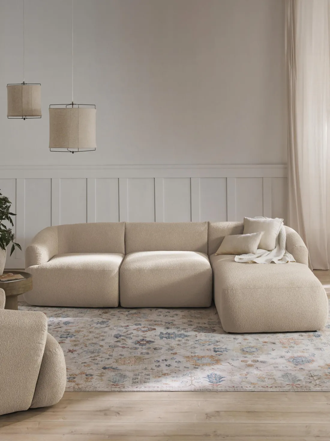 La chaise longue está al lado derecho cuando estás frente al sofá.