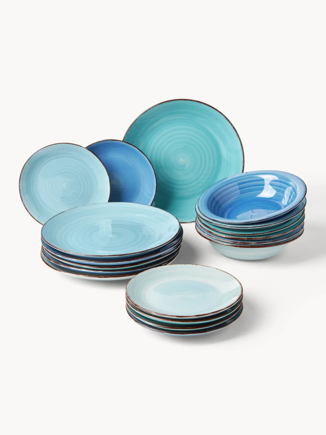 Vajilla de 18 piezas que consta de 6 platos llanos, 6 platos hondos y 6 platos de postre en 6 colores diferentes.