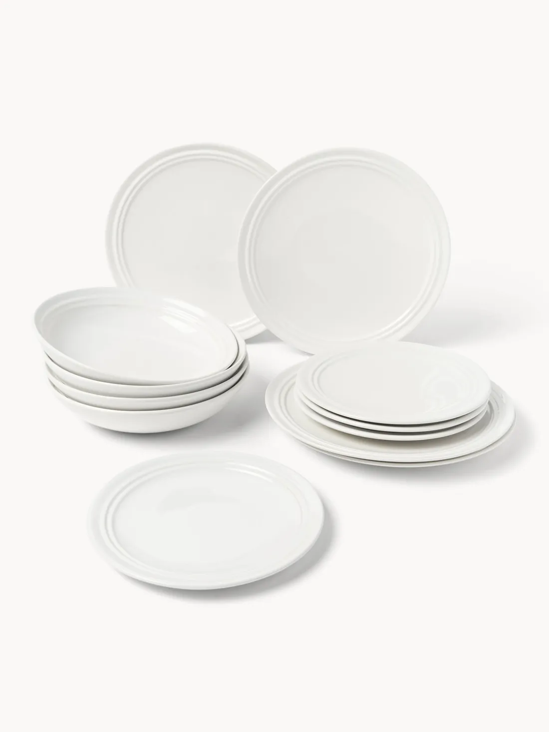 Esta vajilla artesanal de 12 piezas consta de cuatro platos llanos, cuatro fuentes y cuatro platos de postre.