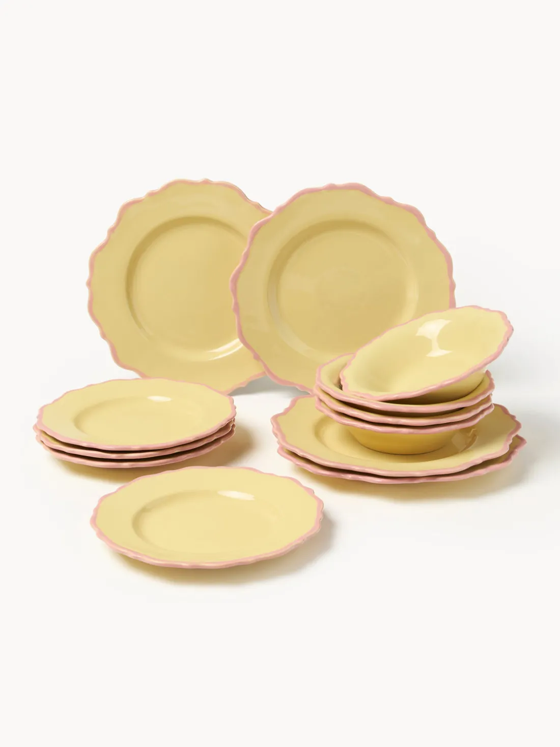 Vajilla de 12 piezas que consta de cuatro platos llanos, cuatro platos hondos y cuatro platos de postre.