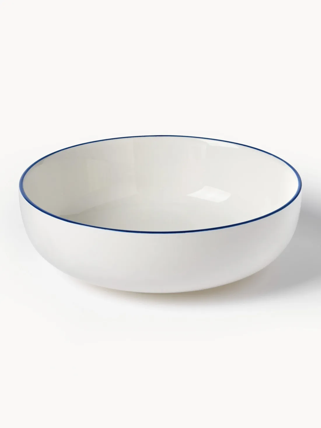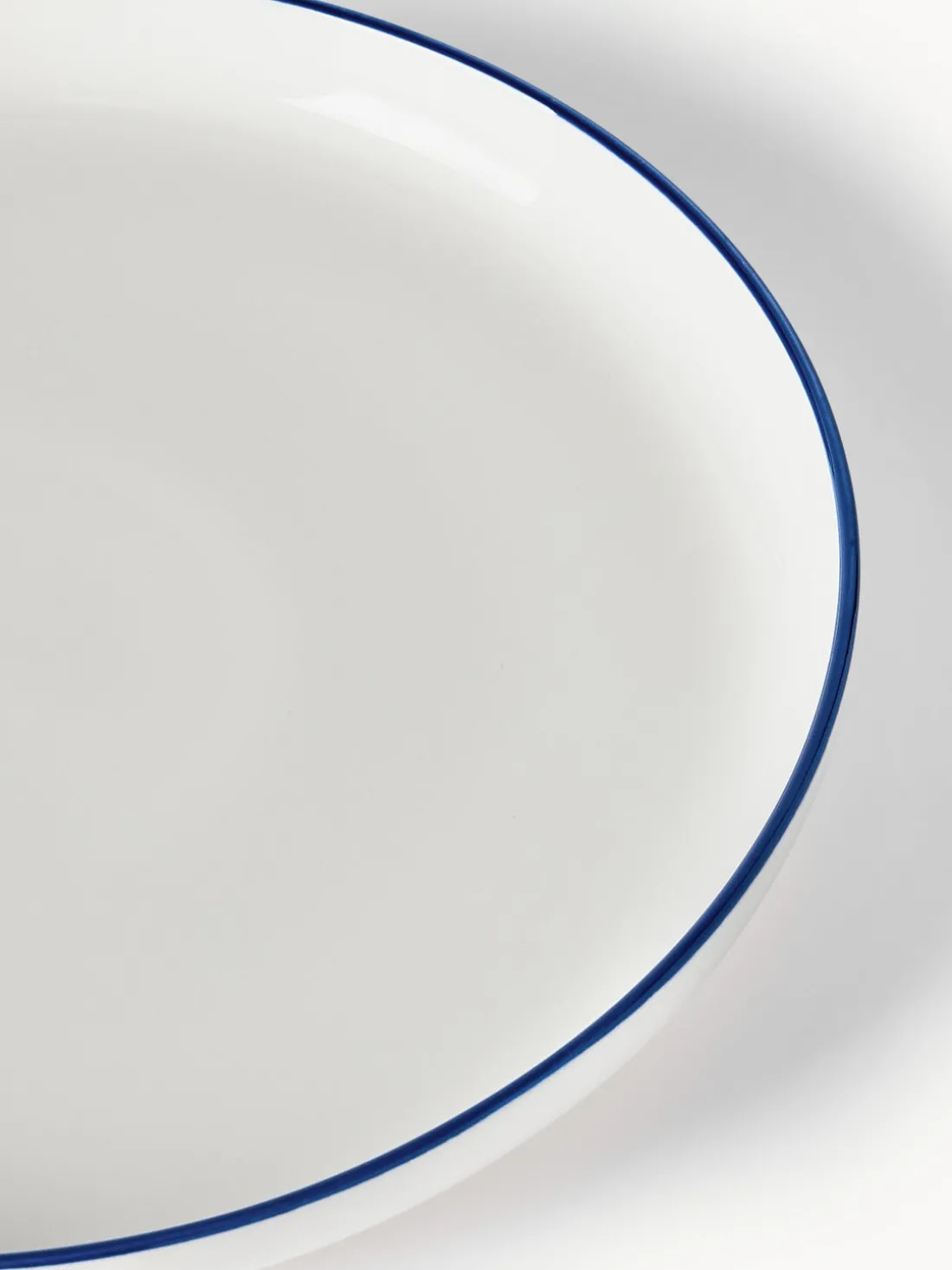 Esta vajilla de 18 piezas con borde azul oscuro consta de seis platos llanos, seis platos hondos y seis platos pequeños.