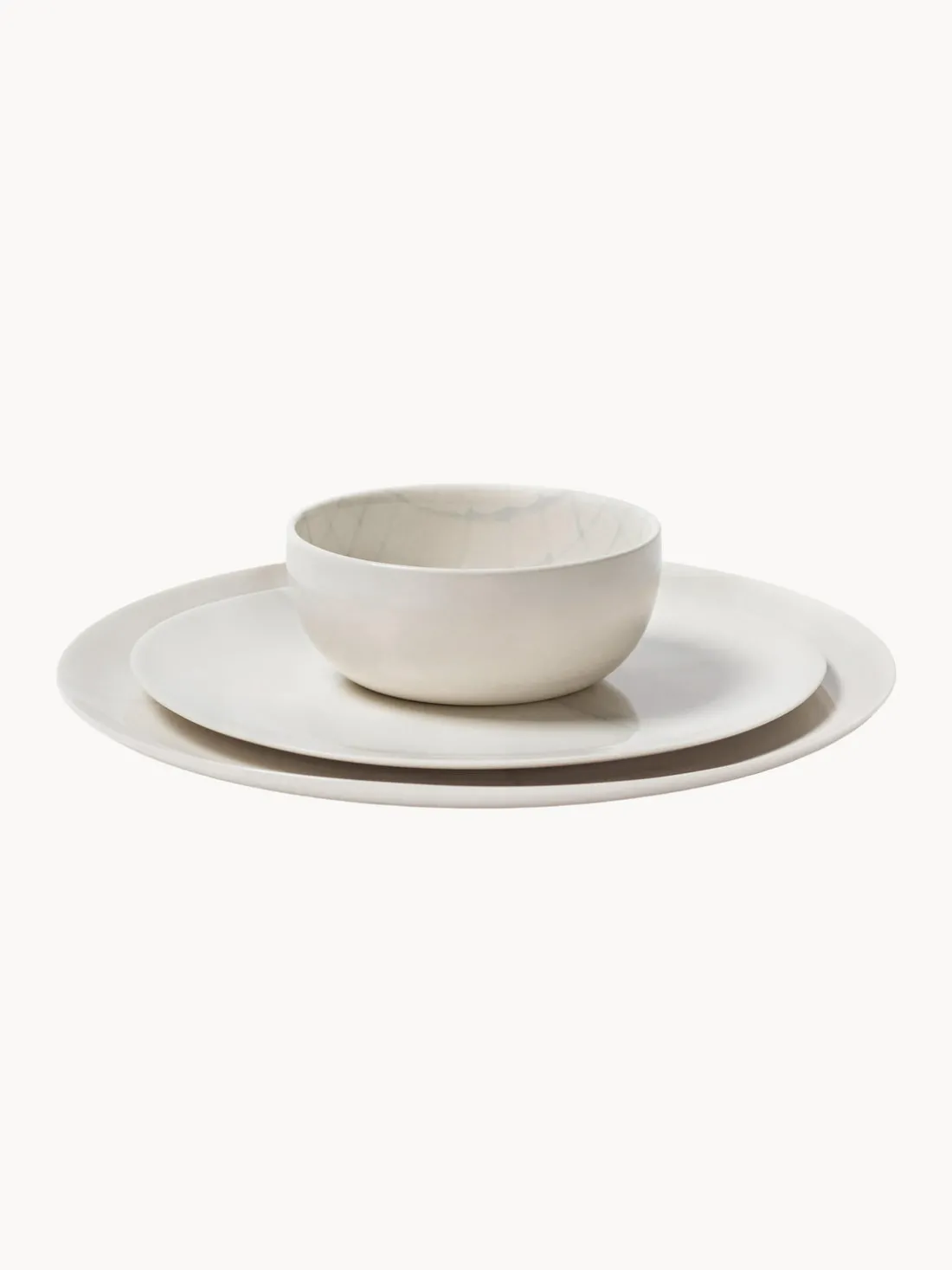 Esta vajilla de esmalte reactivo de 12 piezas consta de cuatro platos llanos, cuatro platos postre y cuatro cuencos.