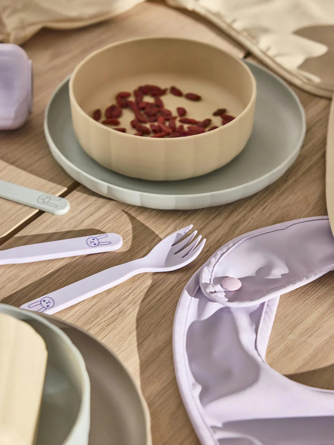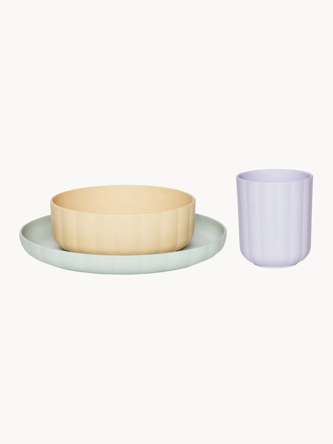 Vajilla infantil de 3 piezas compuesta por plato, cuenco y taza. Adecuado para niños a partir de 1 año.